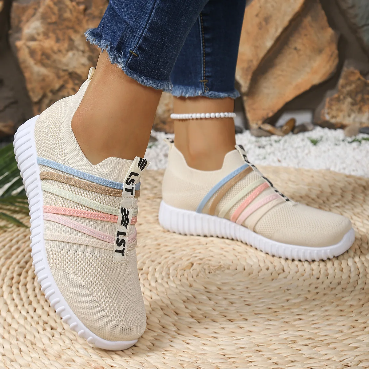 Women's Knit Slip-On Sneakers: Lightweight Breathable Casual Shoes with Colorful Stripes for Daily Wear