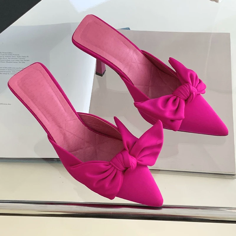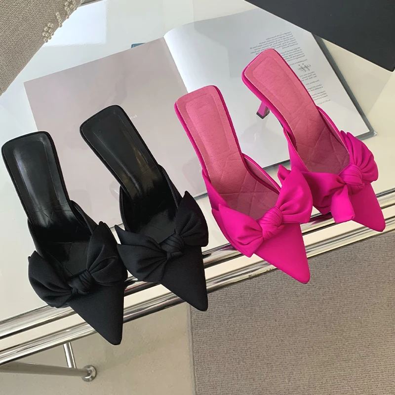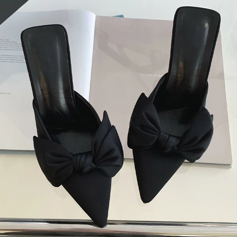 BABALA Ultra-Comfortable Ladies Bow Party Wear High Heels Slippers Pointed Toe Party Shallow Mouth Lace Spike Heels