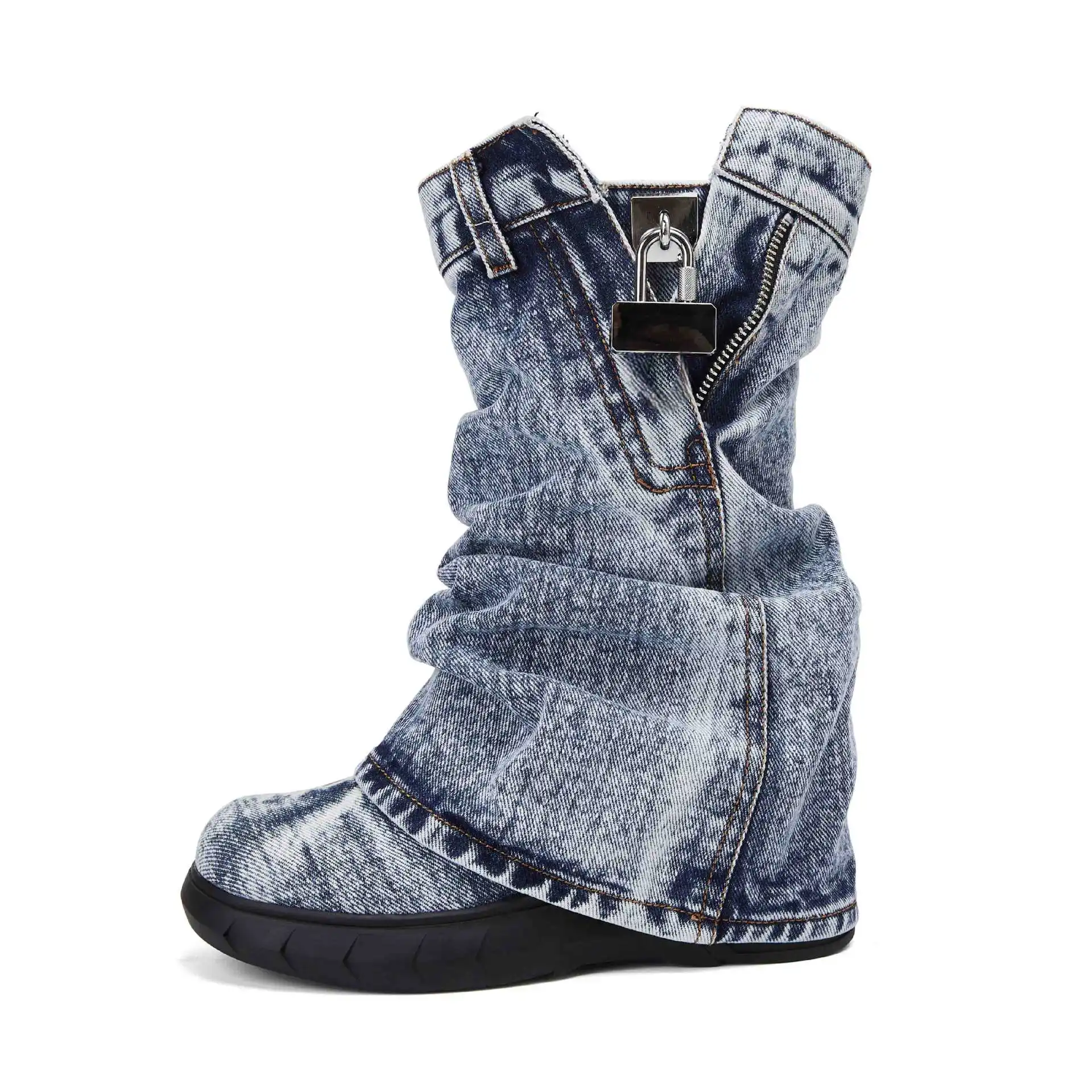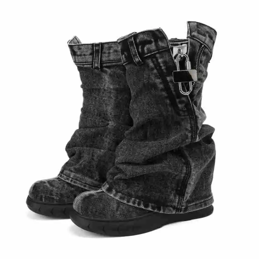 2026 Winter Thick-Soled Washed Vintage Denim Boots Slip-On Closure Super High Heel Mesh Unique European American Style Women's