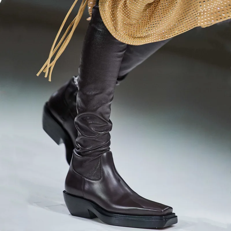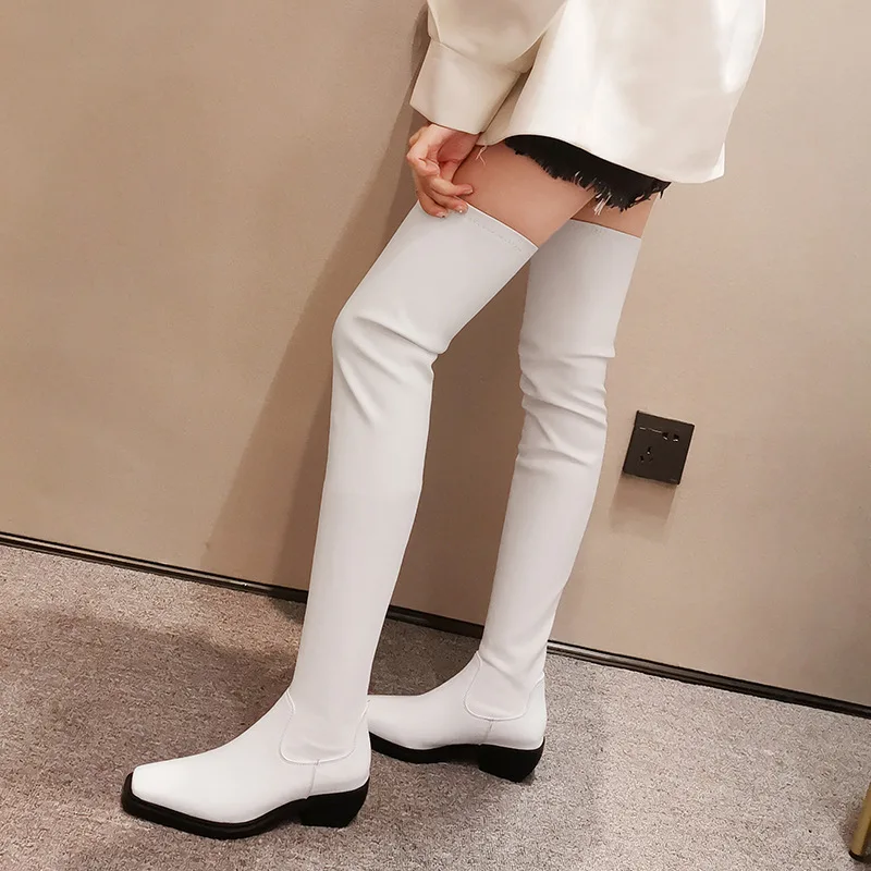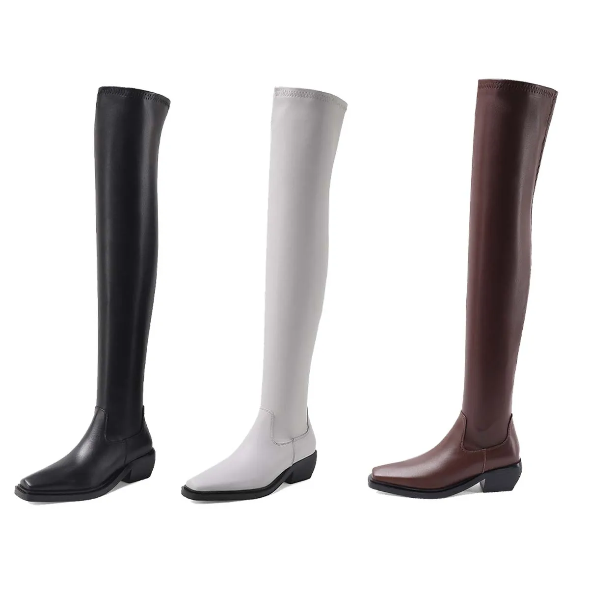 2020 New Over-The-Knee Square Toe Mesh Lining Genuine Leather Stretch Boots Chunky Heel Leg-Slimming Winter