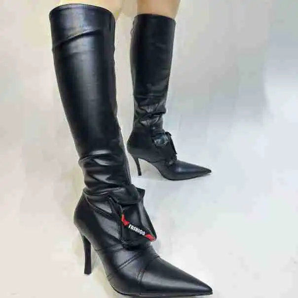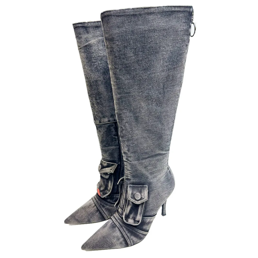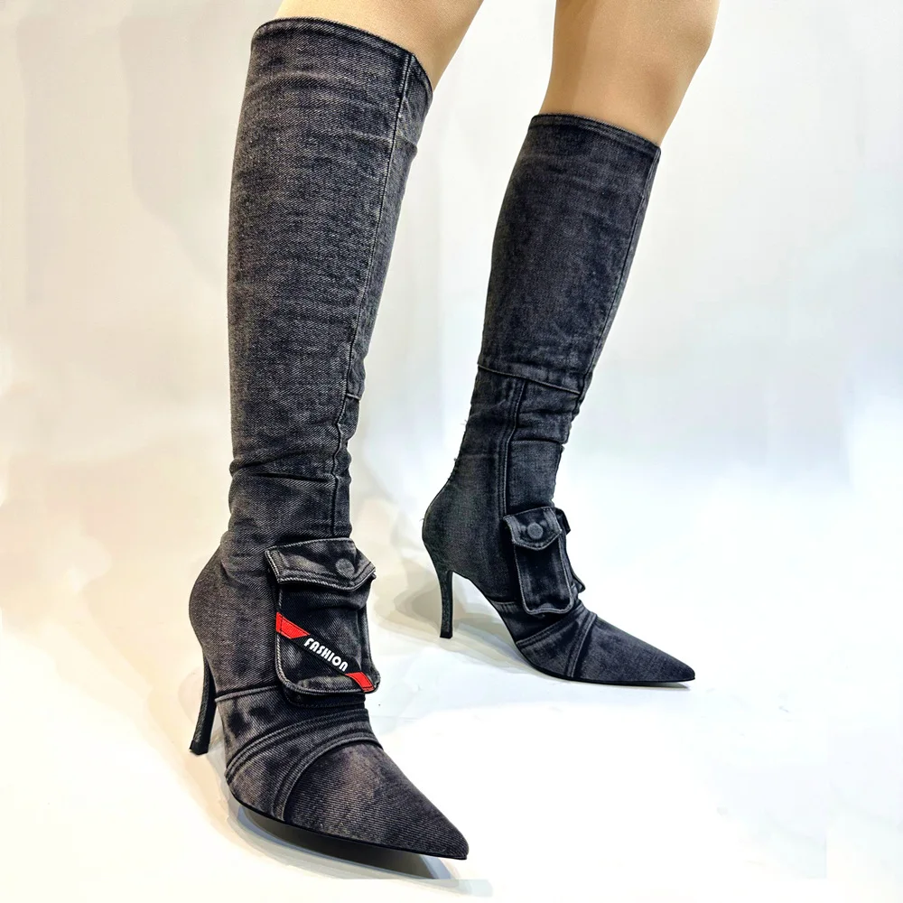 2023 Cowboy Boots Fashion Pointed Toe Knee-High Super High Heel Washed Retro Back Zipper PU Upper Rubber Outsole Women's Large