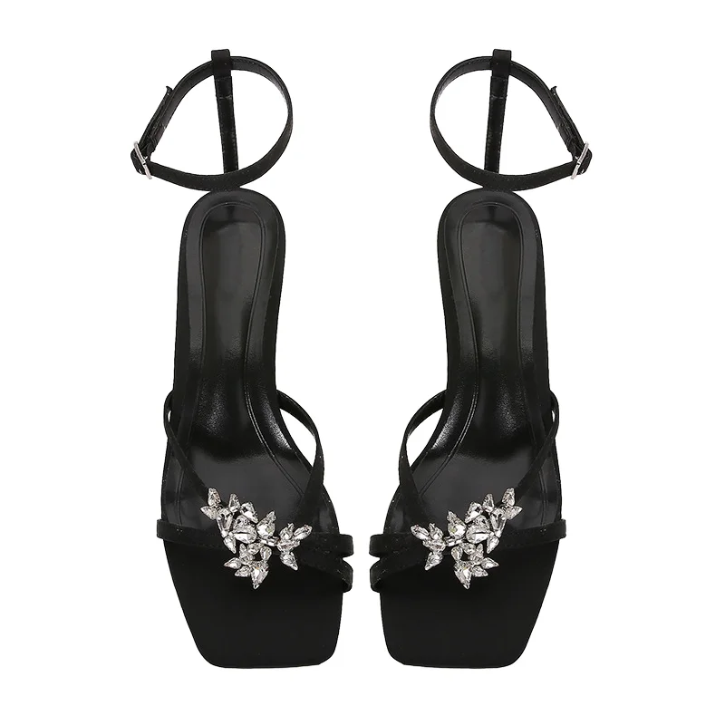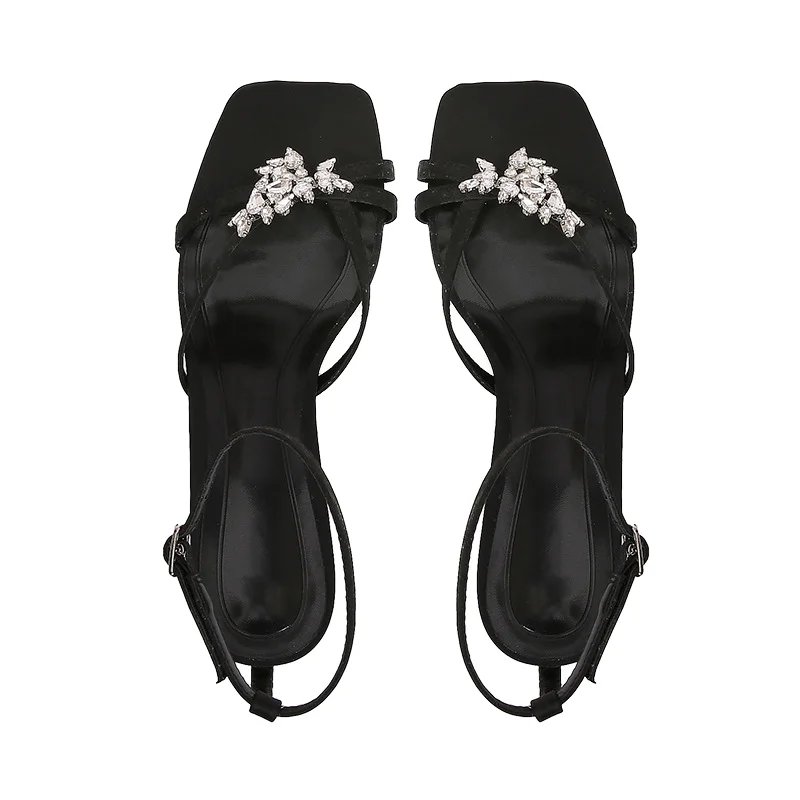Custom Design Women's Open-Toe Sandals Black Rhinestone Decor One-Strap Square Stiletto Heel Open Back Fashion Shoes