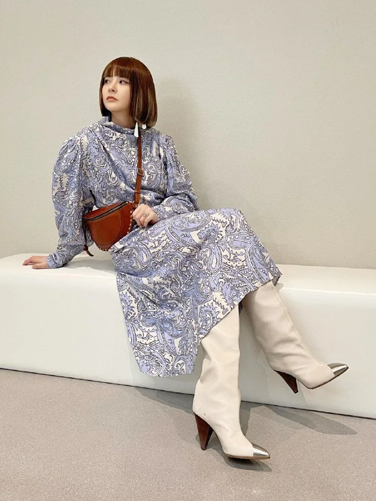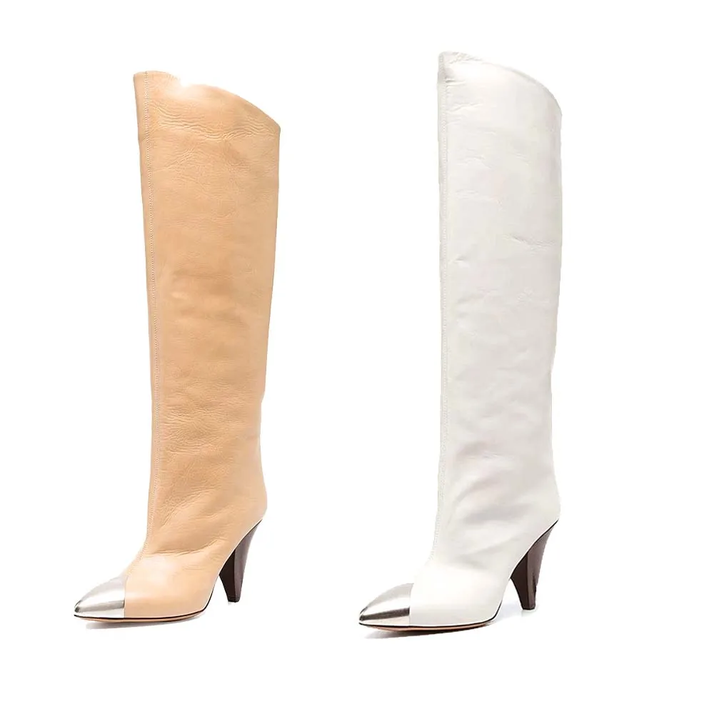 2021 High-Heeled CHELSEA STYLE Pointed Toe Iron-Toe Boots PU Upper Rubber Outsole Thin Heel Slip-On Closure Winter Knee-High