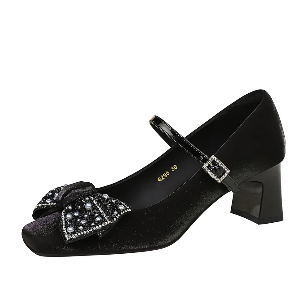 Women's Chunky Heel Mid Heel Shoes Versatile Satin One-Strap Square Toe Mary Jane Rhinestones Bowknot Height Increasing High Top