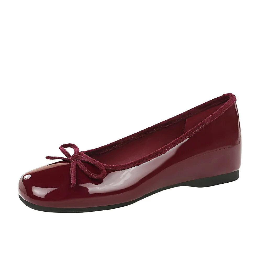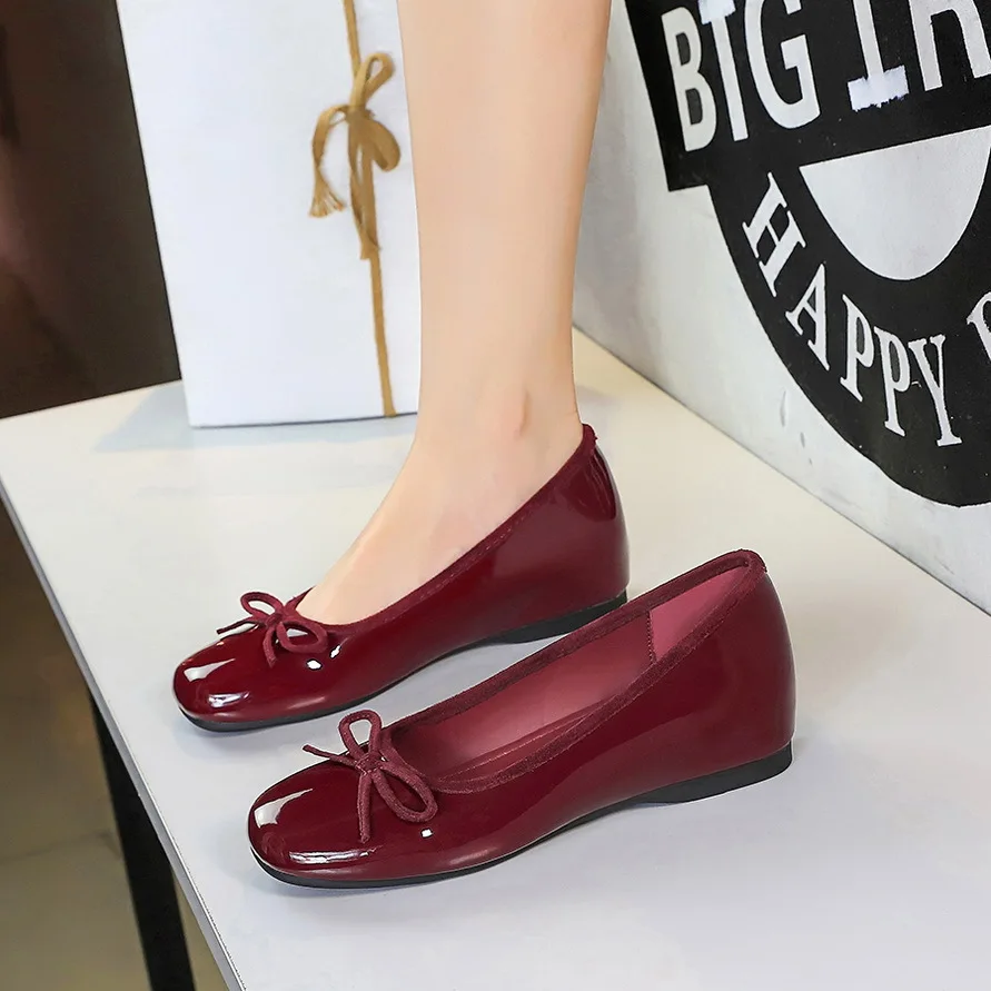 836-11 French-Style Sweet Inner-Height-Increasing Bow-Decorated Round-Toe Shallow Patent Leather Slip-On Shoes for Women Flats