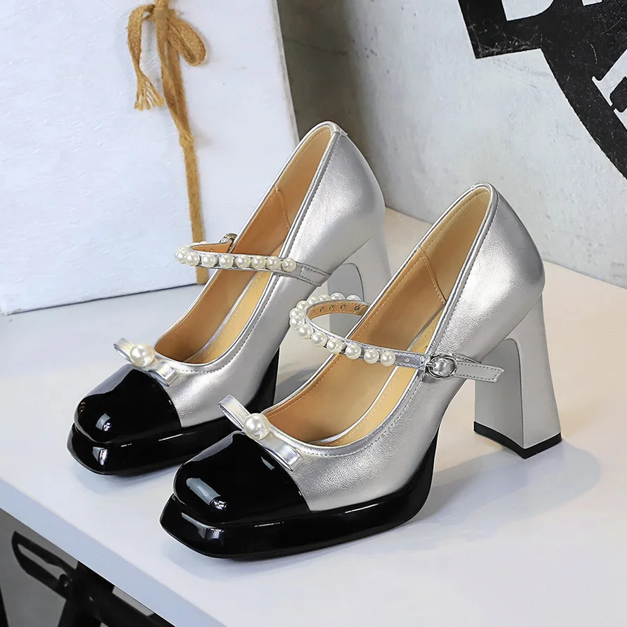 9988-H88 Women's High Top Mary Jane Shoes Waterproof Platform Bow Tie Single Strap Pearls Square Toe Chunky Heel High Summer