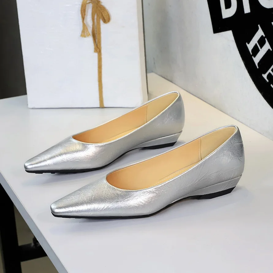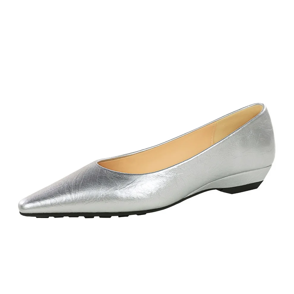 Women's 3683-20 Single Shoes Slip-On Silver Pointed Toe Shallow Mouth Low Hepburn Versatile Commuting Granny Shoes
