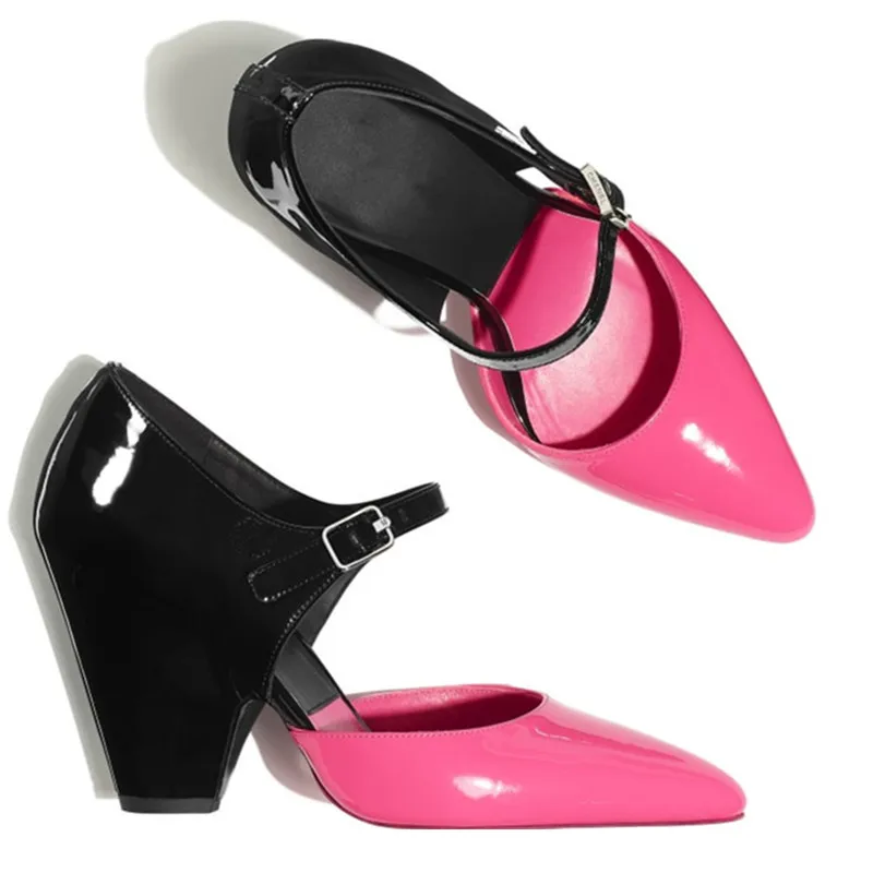 Ladies Fashion Patent Leather Pumps Color-Block Mid-Heel Shoes Hollow Pointed Thick Heel Single-Layer Joker High Heels for Women