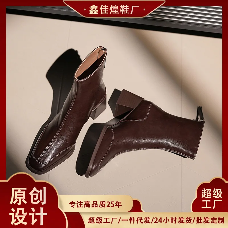 5598-1 British Style Retro Square Head Women's for Martin Boots Autumn Winter High Heel Short Boots Red Brown Knight Boots 6CM