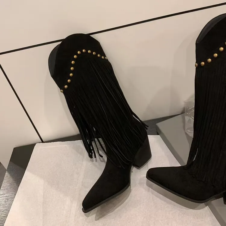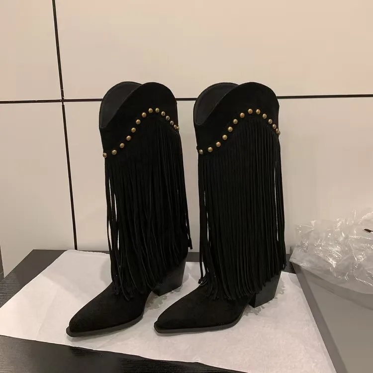 Women's Brown Fur Fringe Cowboy Boots Gold Rivets Pointed Toe Block Heel Western Style Height Increasing Knee-high Fashion Boots