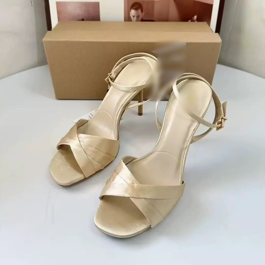 QuiteS Summer 2026 New Women's Shoes Light Beige Satin Square Toe One-Strap High Heel Sandals Luxury Femmesr Fashion Shoes