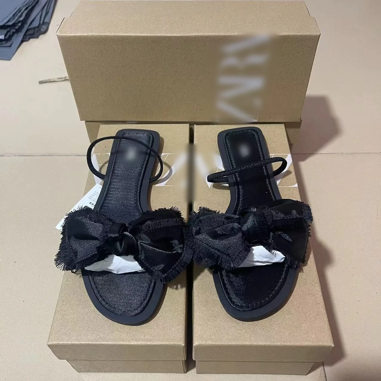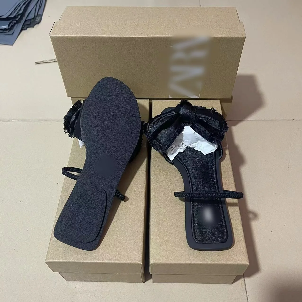 QuiteS Summer New Flat Sandal with Black Bow Open Toe and Casual Style One Strap Anti-Slip Beach Vacation for Slippers for Women