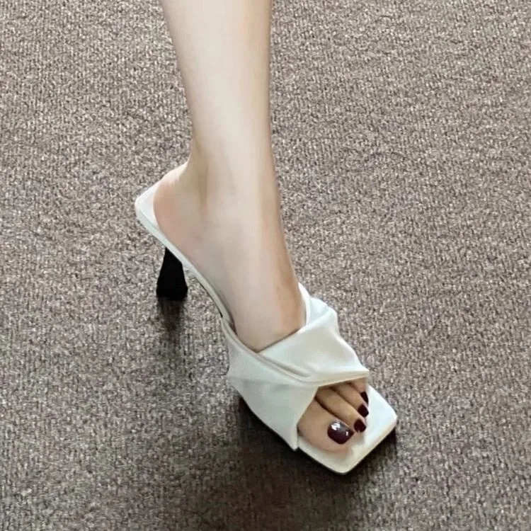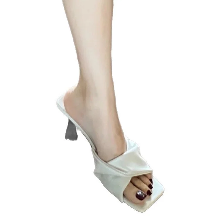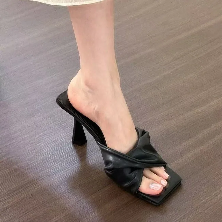 QuiteS 2026 Women's Elegant Office Party Shoes New Summer Open Toe High Heel Casual Slip-On Pleated Square Toe for Outdoor Use