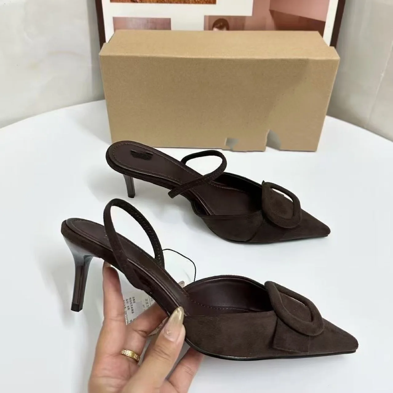 QuiteS 2026 New Summer Pointed-toe Suede Square Buckle One-strap High-heeled Backheel Flip-flops Shoes for Women