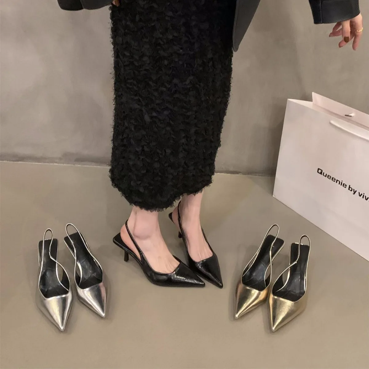QuiteS 2026 Spring Summer Collection Single French Toe Silver High Heels Sandal Sexy Pointed Bao Toe Design Slip-On Closure