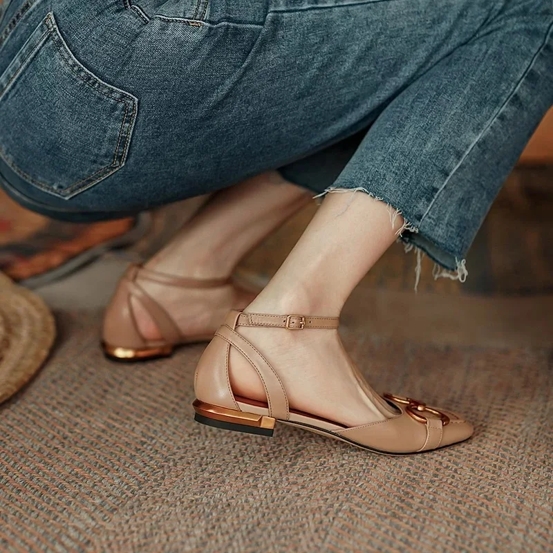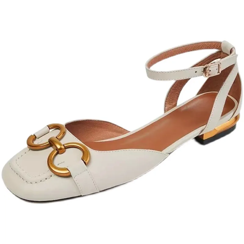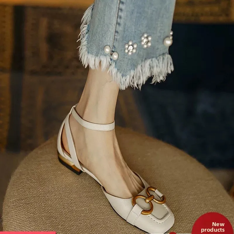 QuiteS 2026 Women's Summer Casual Shoes New Korean Style Closed-Toe One-Strap Chunky Heel Square Toe Versatile Solid Flat Sexy