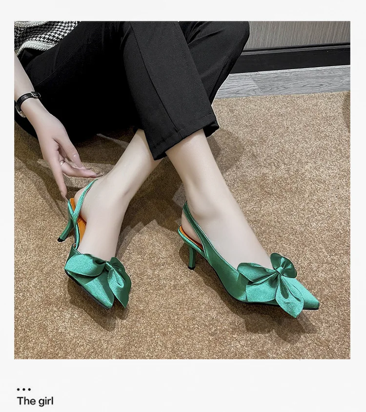 QuiteS Large Size Sandals 2023 Summer New Fashion Solid Color Bow Pointy Thin Heels High Heels for Women
