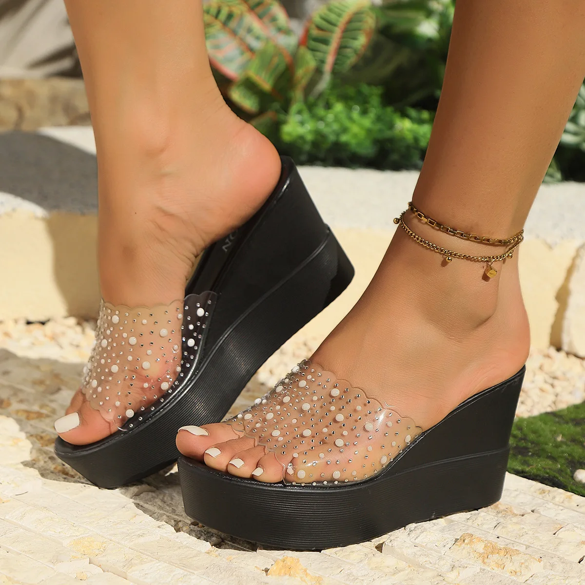 QuiteS 2026 New Plus Size Transparent High Heels Rhinestones Thick Sole Outdoor Wedge Sandals Large Size Casual Shoes for Women