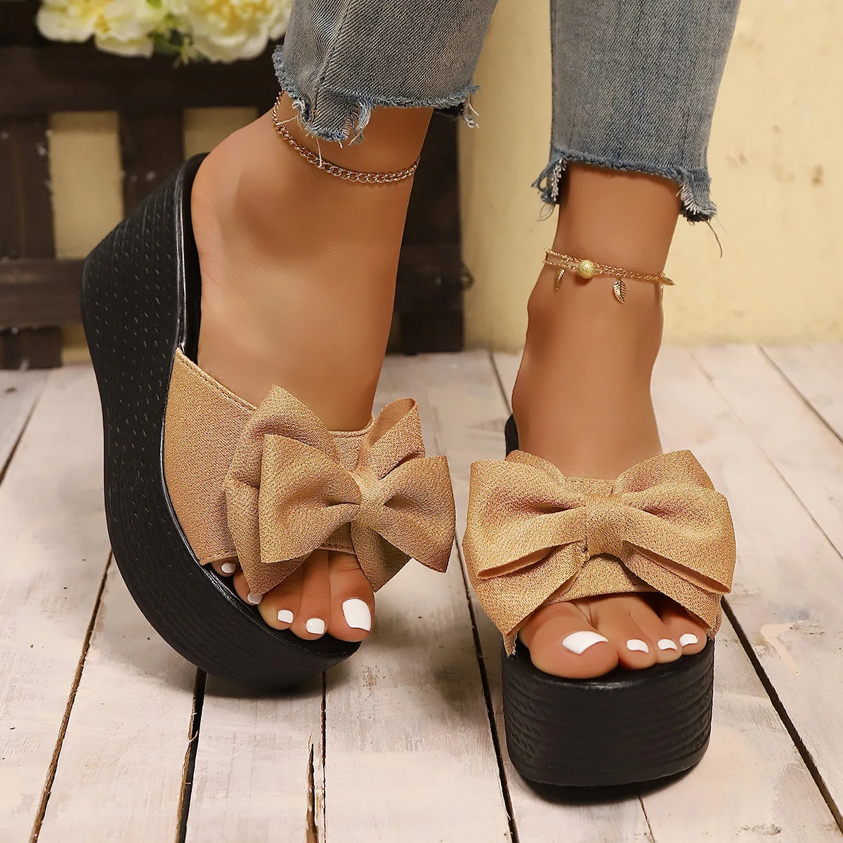 QuiteS Wholesale 2026 Plus Size Bowknot Peep Toe Wedge Thick-Soled Waterproof Slip-On Sandals Casual Sexy Beach Shoes for Women