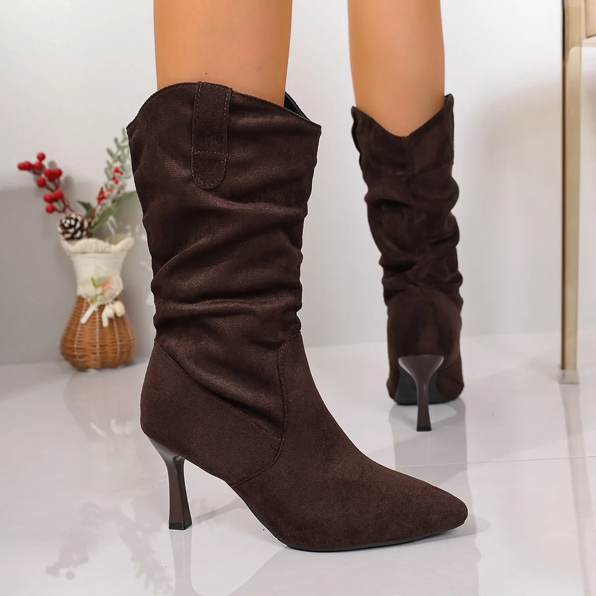 QuiteS 2026 Winter New Plus Size Suede Pointed High Heel Slip-on Solid Fashion Boots Pleated Mid-Calf Shoes for Women