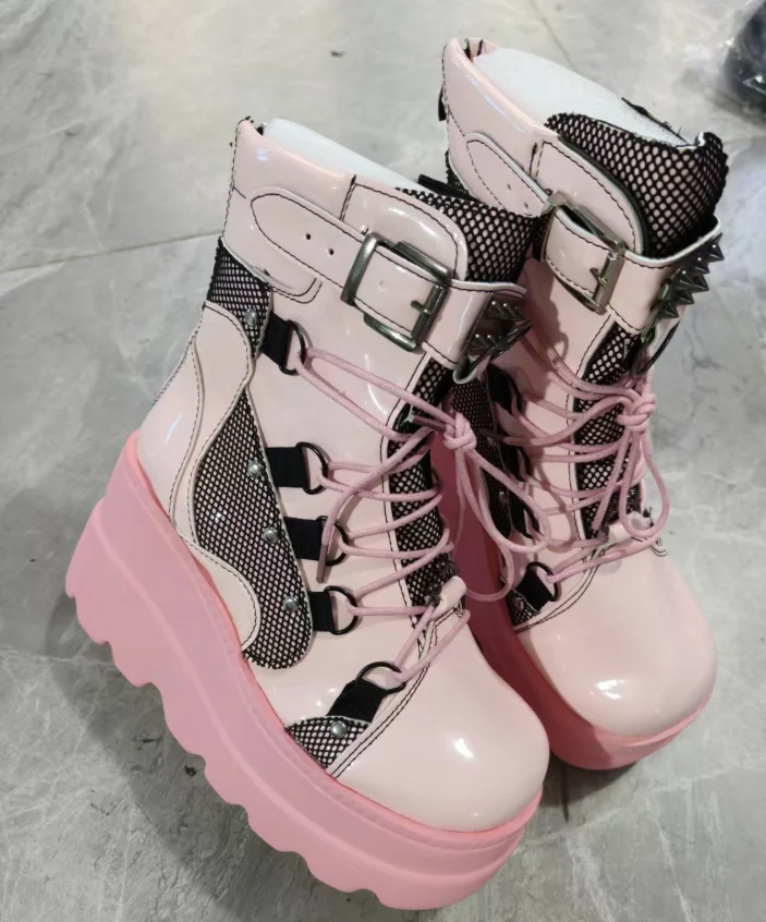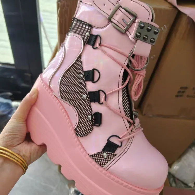 QuiteS 2026 Winter New Punk Style Wedge Heel Lace-Up Solid Color Thick Sole Platform Slim Boots Sexy Casual Shoes for Women