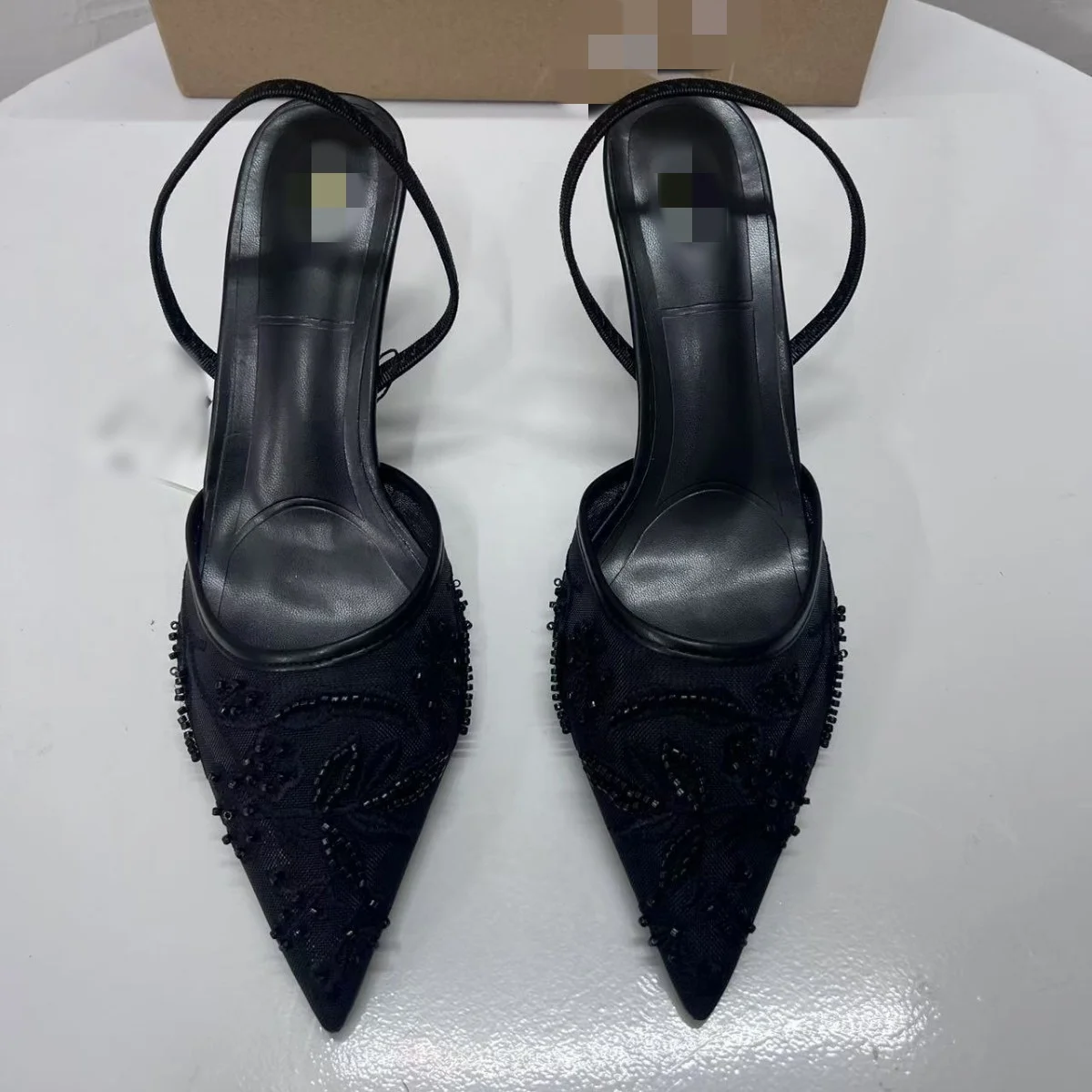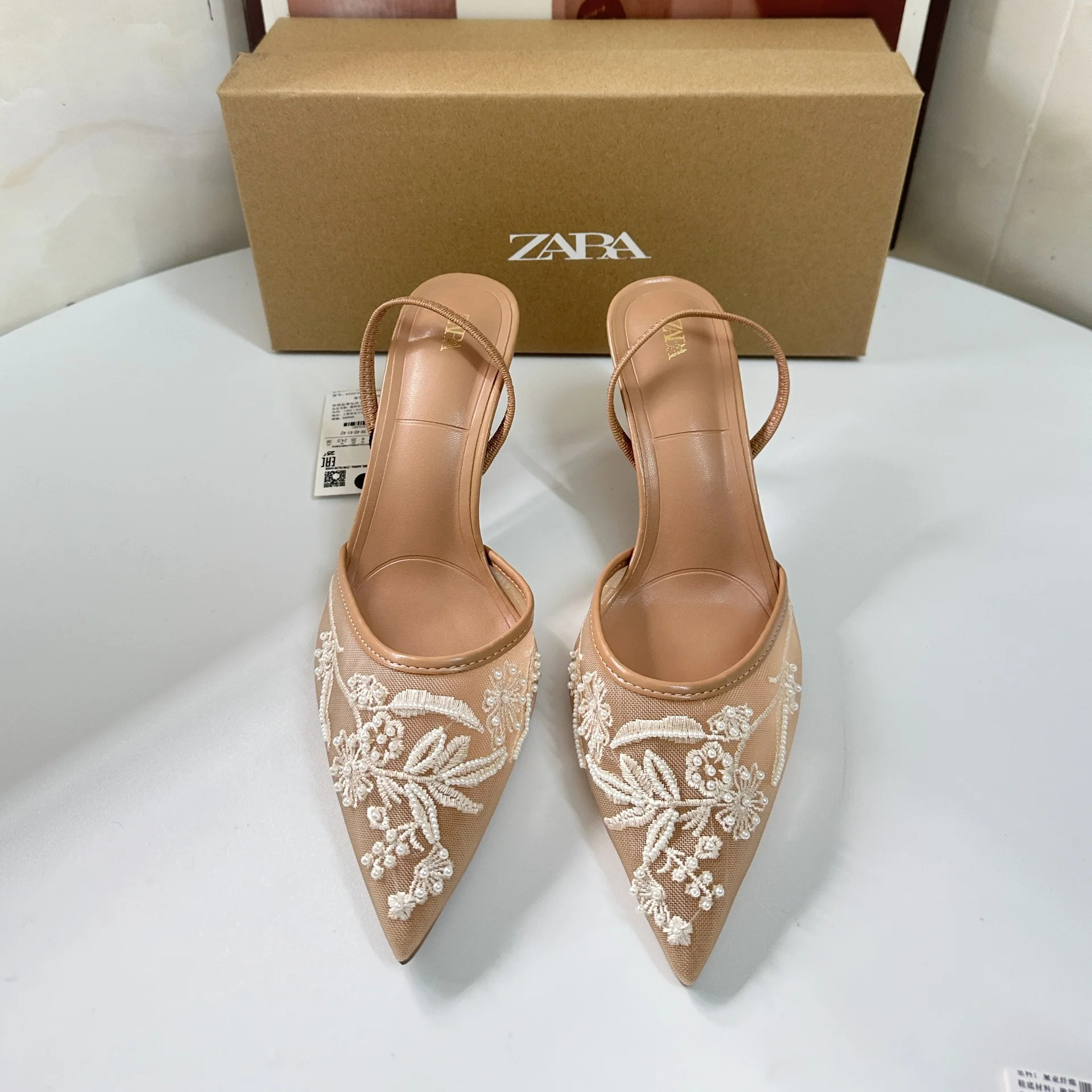 QuiteS Za 2026 New Temperament Stiletto Heels Pointy Toe Slipper Embroidered Beaded Lace Mesh Sandals Designer Shoes Woman