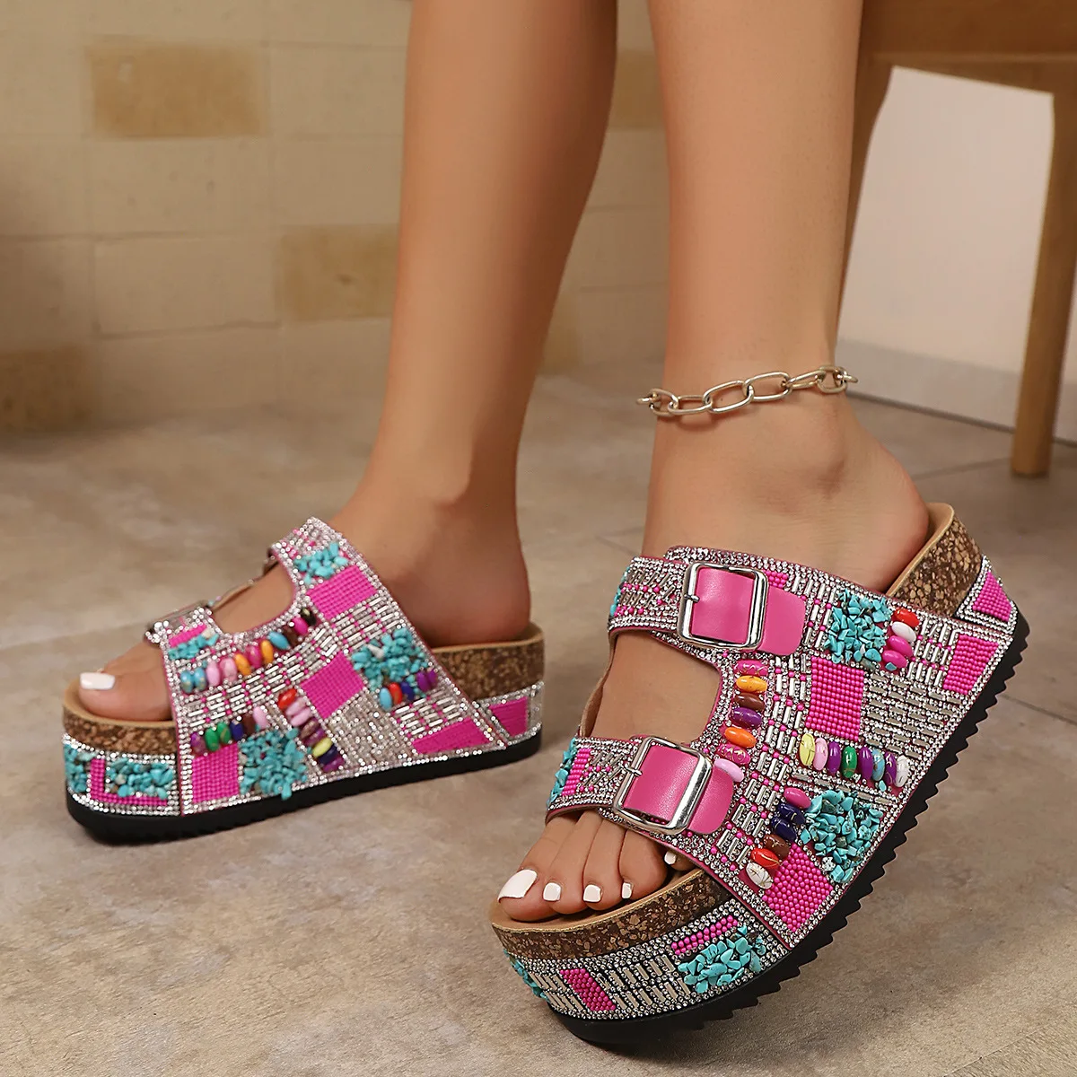 QuiteS 2026 New Large Size Thick Sole Rhinestone Double Buckle Head Rubber Flat Casual Sexy Beach Shoes for Women