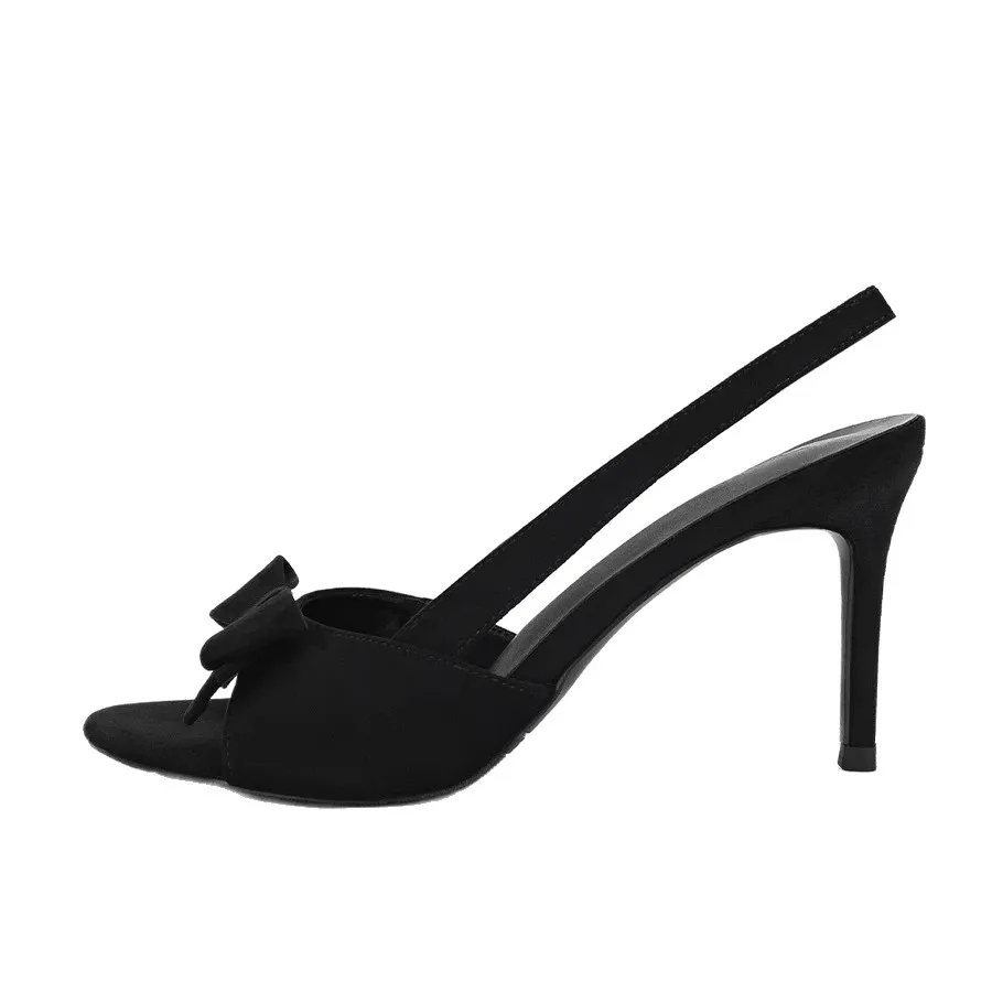 QuiteS 2026 New Bowknot Black Suede One-Strap Stiletto Heel Vintage Rubber Sandals Sexy Open-Toe Shoes for Women