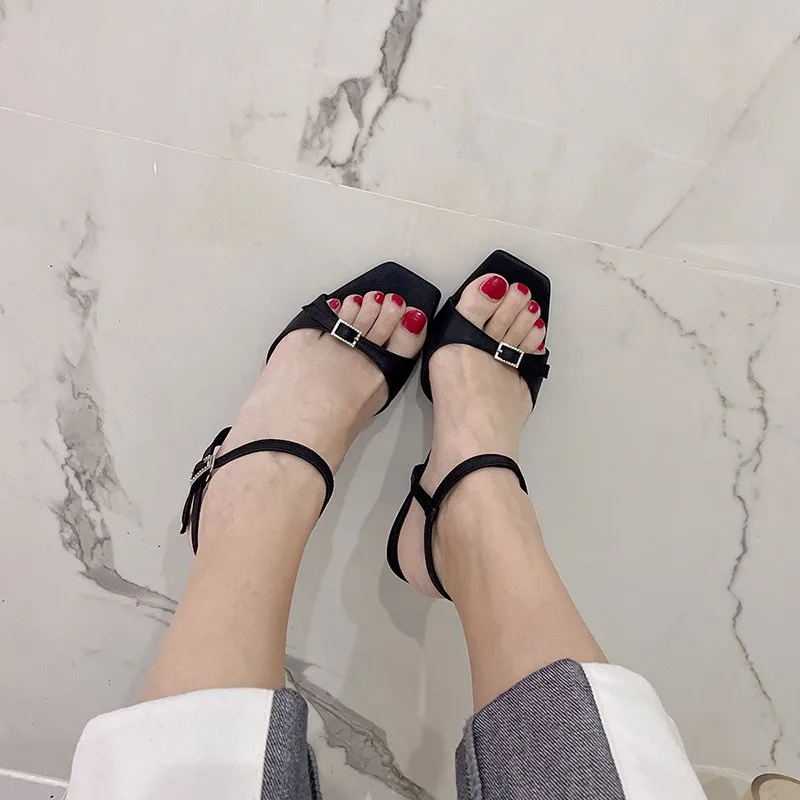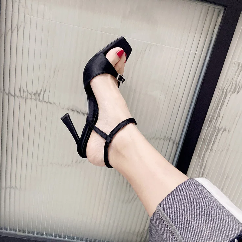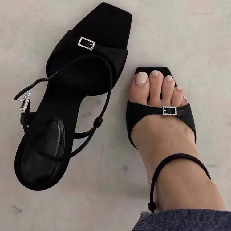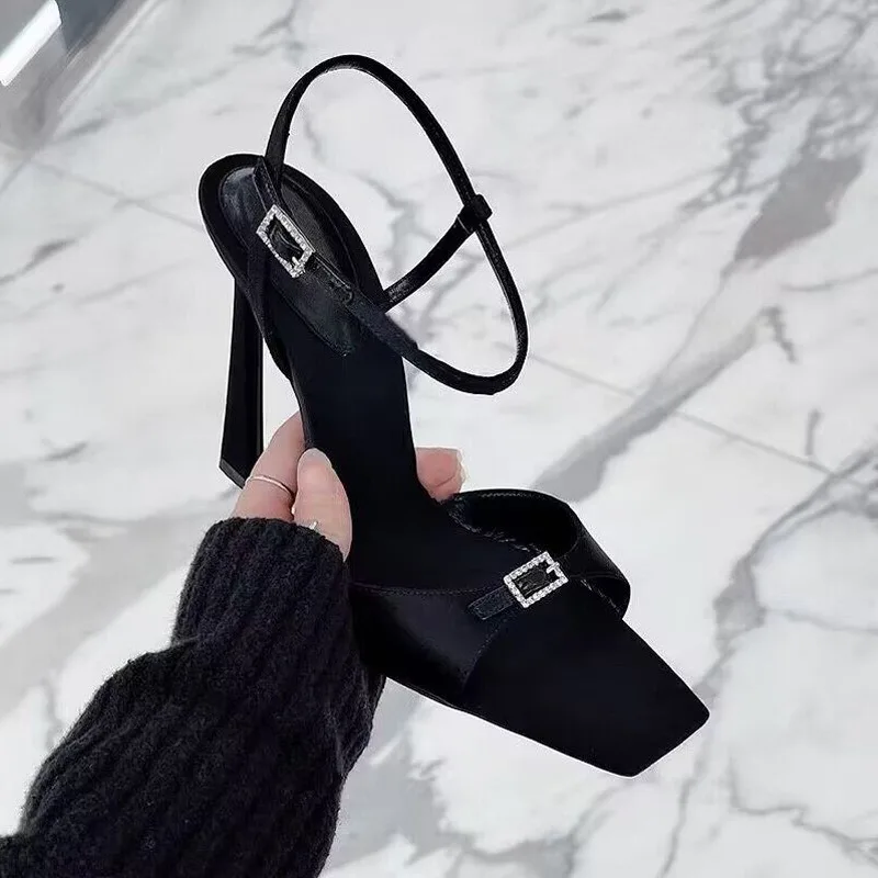 QuiteS 2026 Summer Women's Stiletto Satin Sandals Simple Black Open Toe Square Head High Heels New Fashionable Waterproof