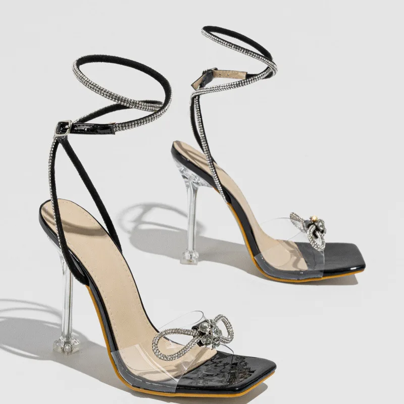 QuiteS 2026 Women's Transparent Stiletto High Heel Sandals Rhinestone Bowknot Nightclub Bar Party Shoes Open Versatile for