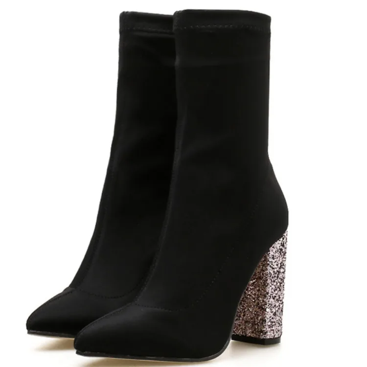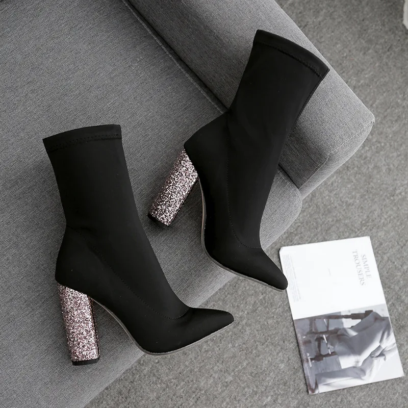 New Winter Middle Cylinder Ankle Pointed Toe Ladies Metal Sequins Crude High Heels Booties Elastic Force Socks Women Shoes