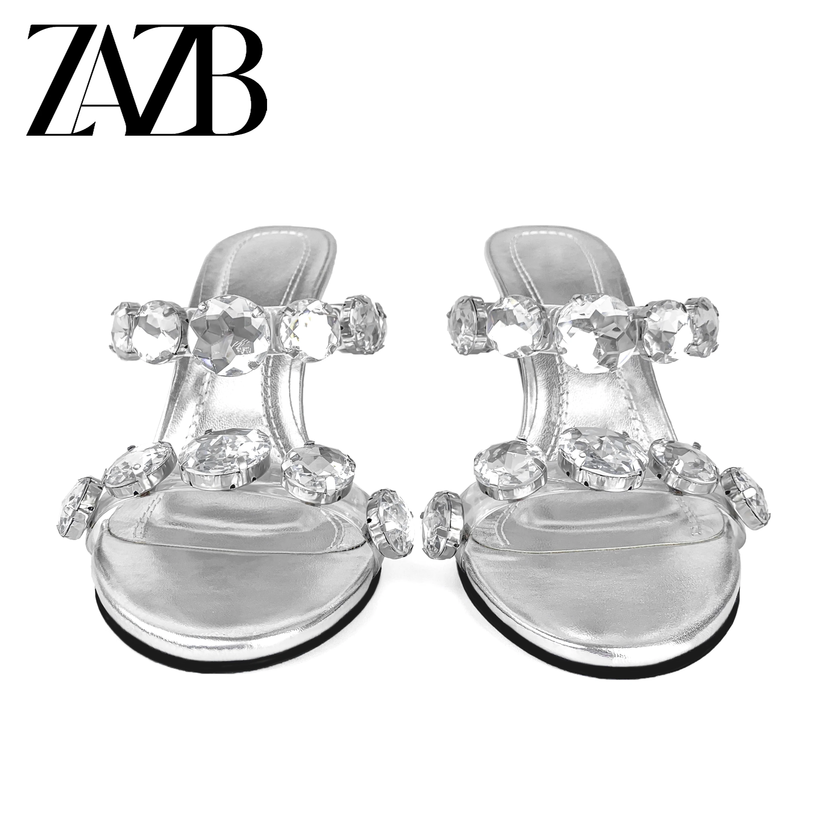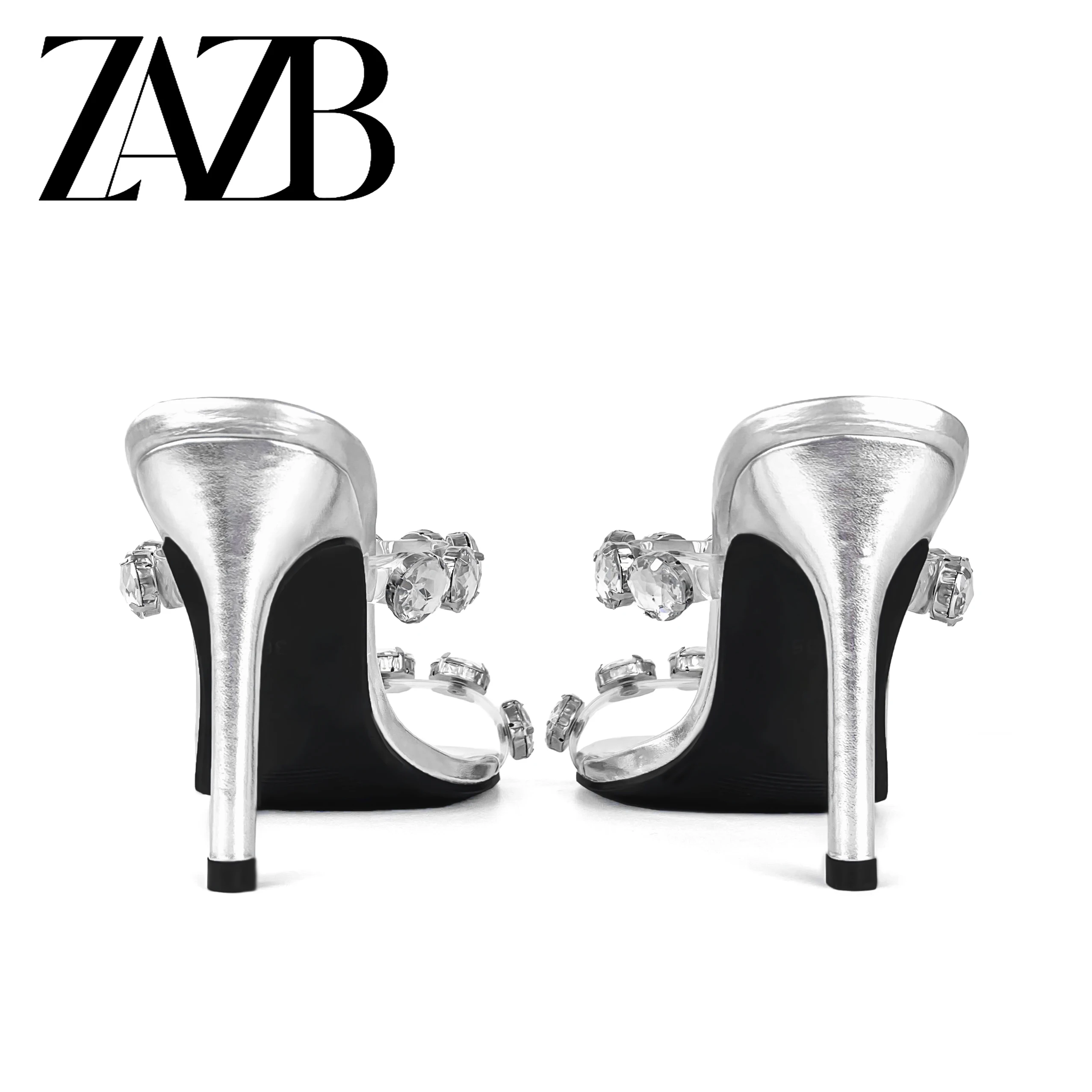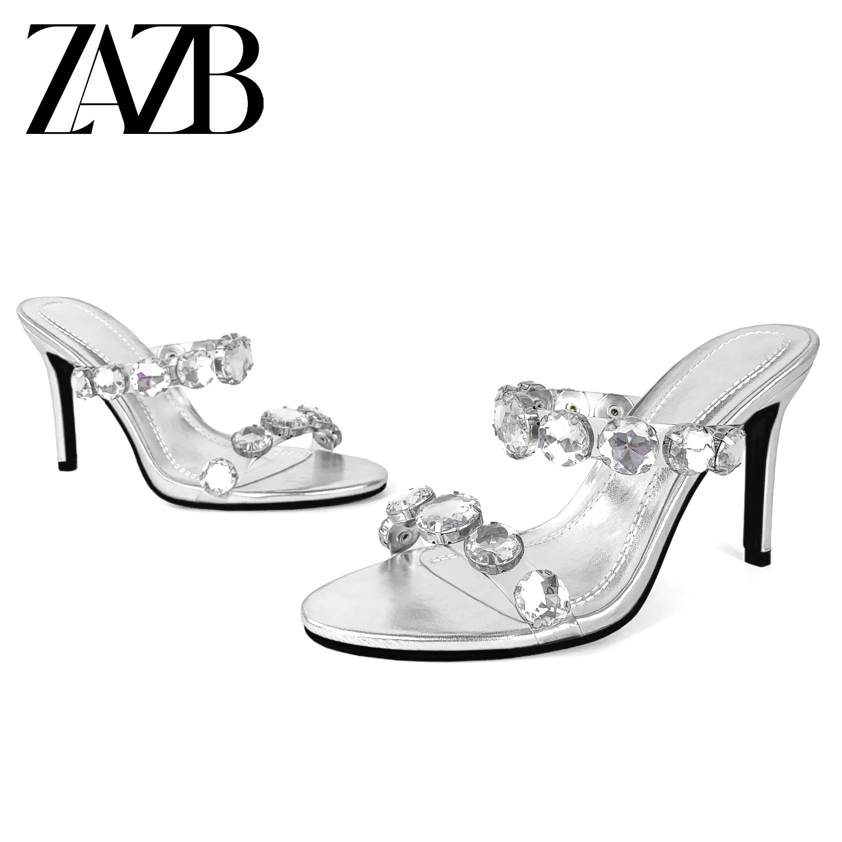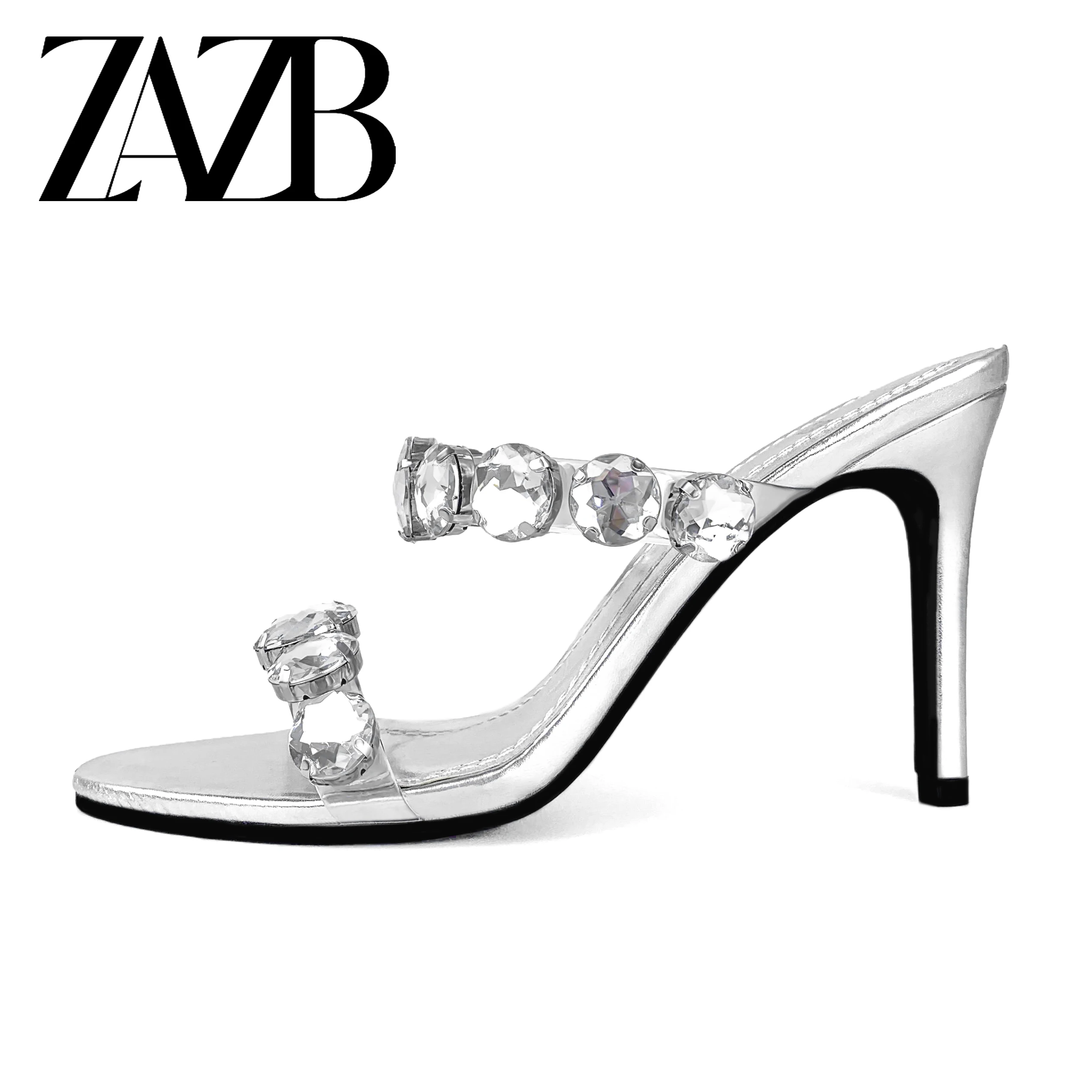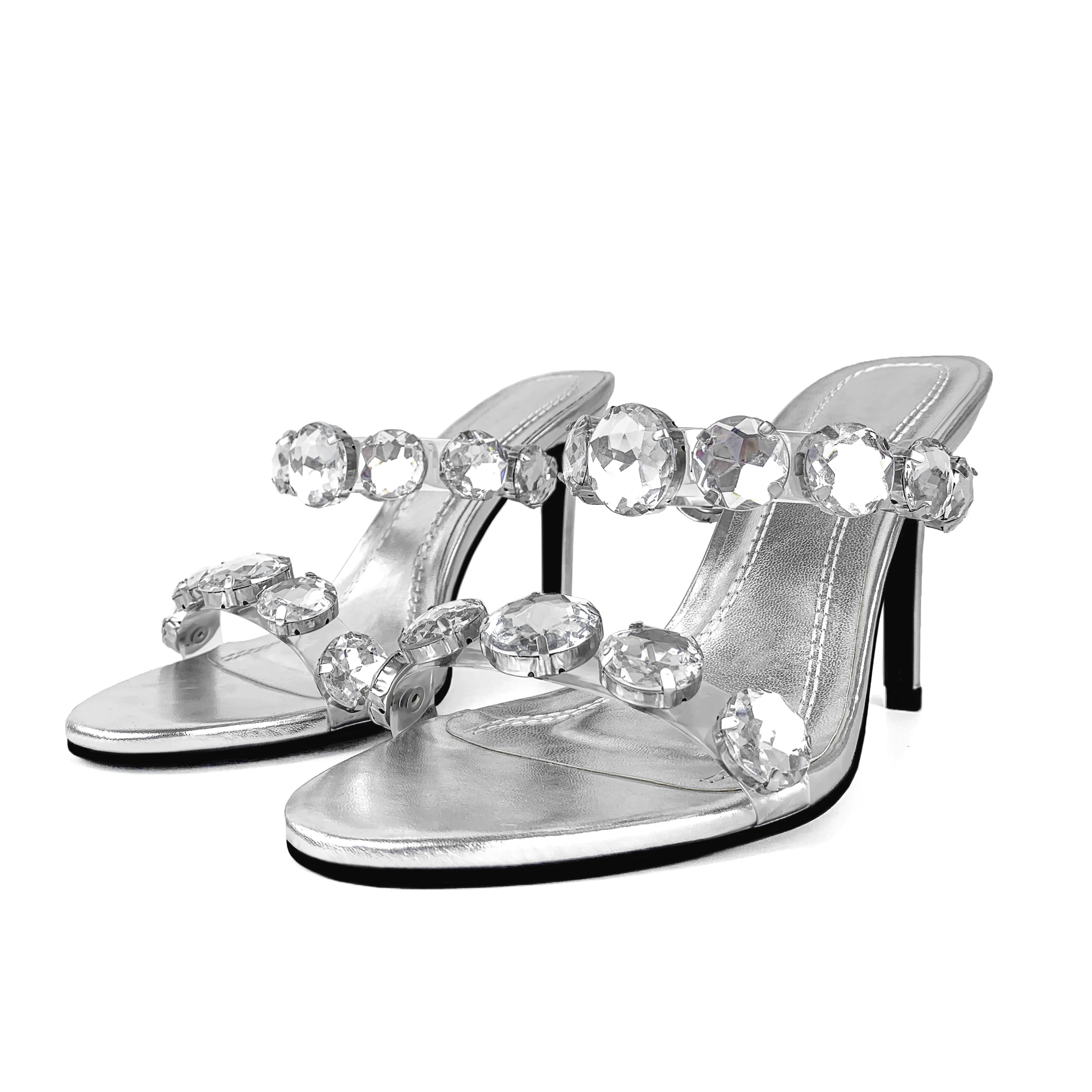 ZAZB Brand Customized Leather Silver Rhinestone High Heel Slippers Women's Slippers Wedding Bride Women's Dress