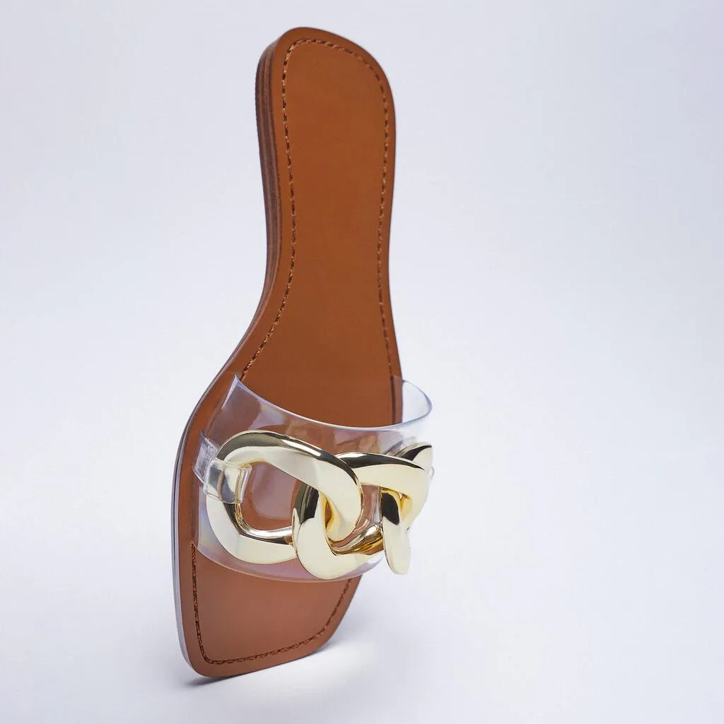 new style design summer open toe Metal Chain flat base women's slippers transparent beach platform sandals for women and ladies