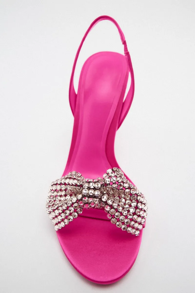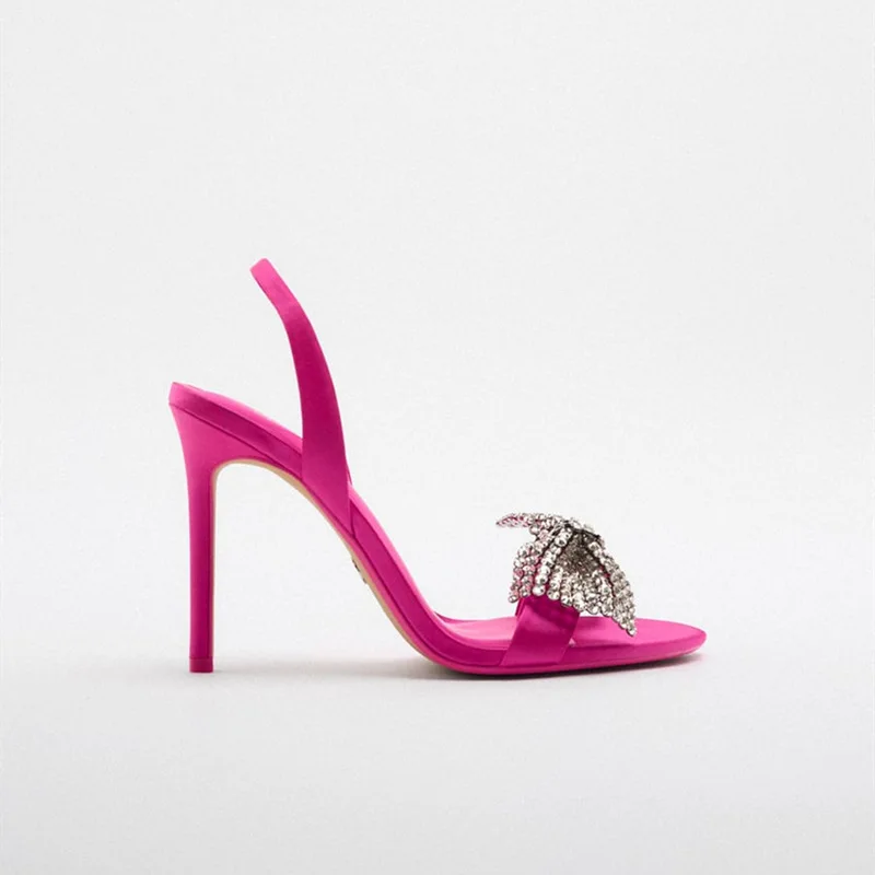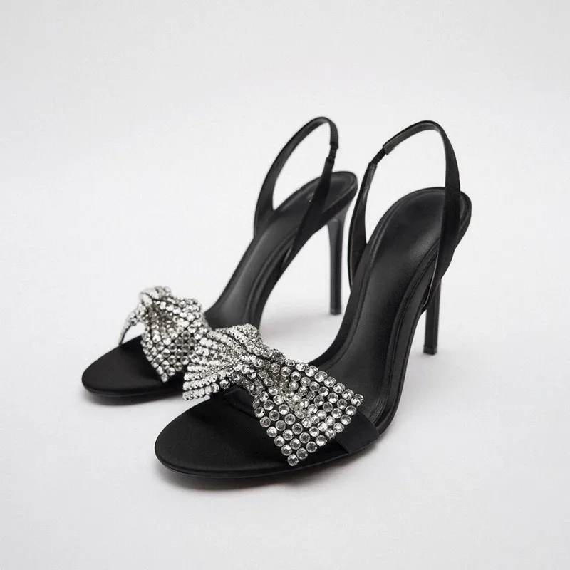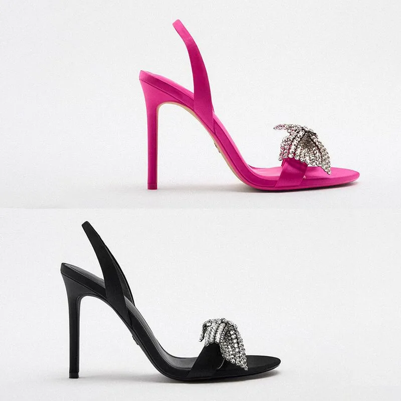 Fashionable Women's Bright Rhinestone Bow High Heels with Thin Heels and Sandals in the Back Half