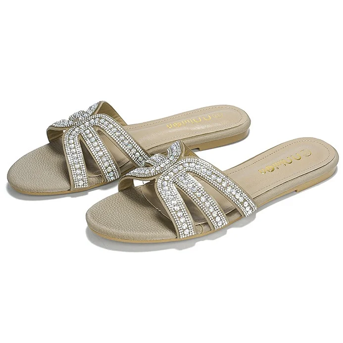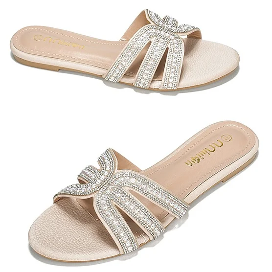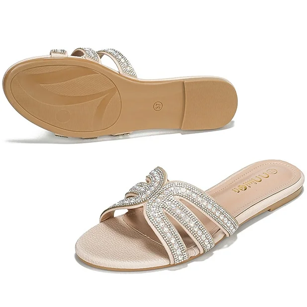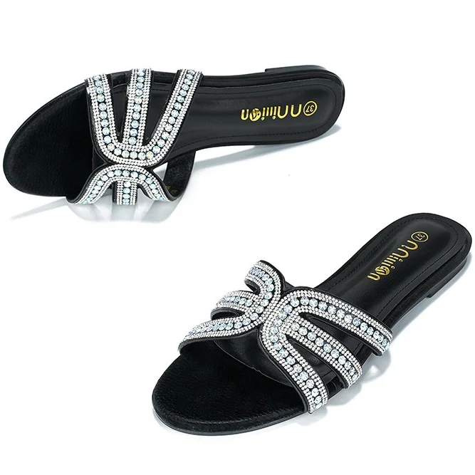 New Design Summer Transparent Crystal Women Flat slippers Open Toe Black Shiny Beads Grace Ladies Sandals