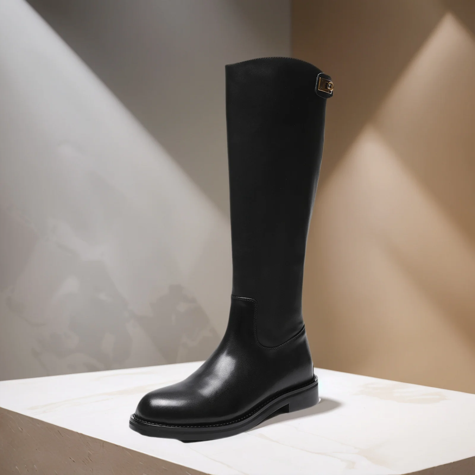 Women's High-Grade Cowhide Leather Boots Toe Chunky Heel Genuine Leather Lining Full Zipper Flat Knight Style for Summer Autumn