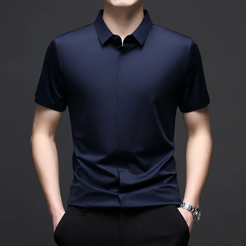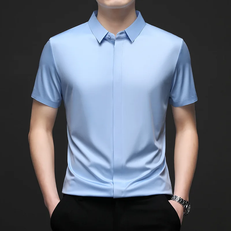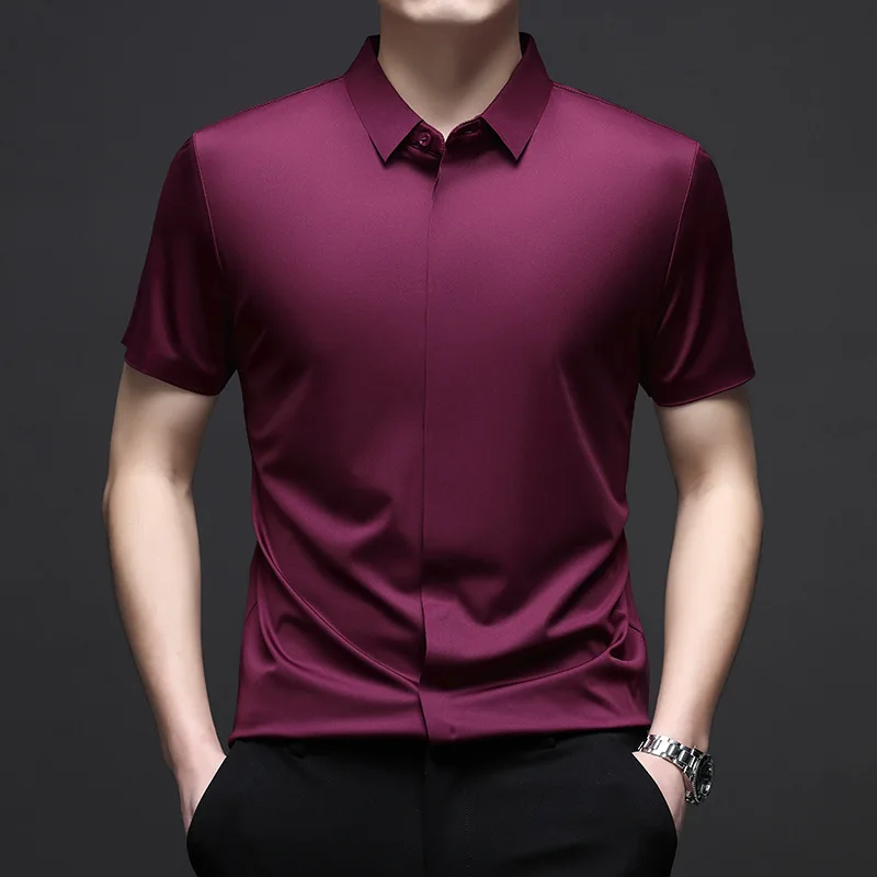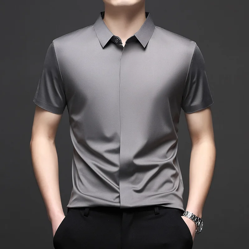 Silk Men Short Sleeve Shirt Business Casual Stretch Pure Color Commercial Affairs Casual Top