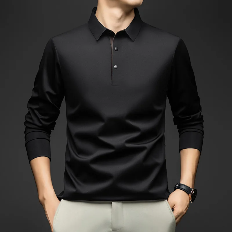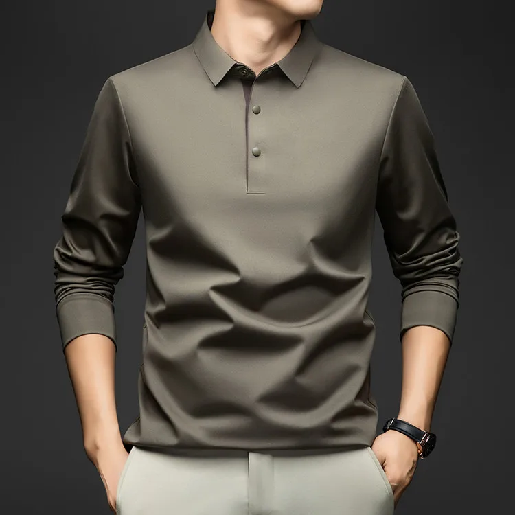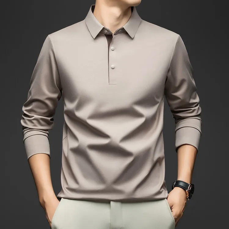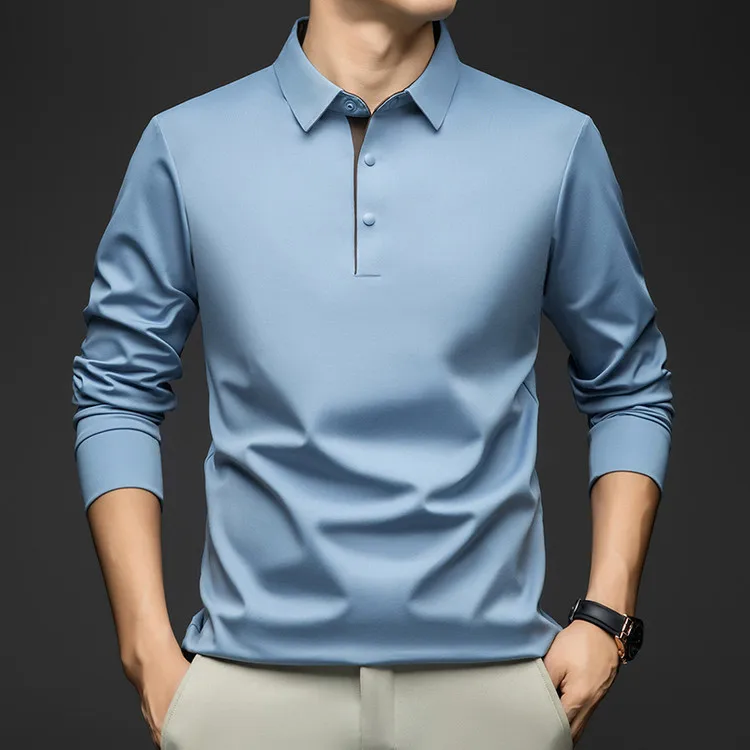 Spring Autumn Men's Mulberry Silk Stand Collar Long Sleeve T-Shirt Eco-Friendly Single Button Light Luxury Feel Print Casual
