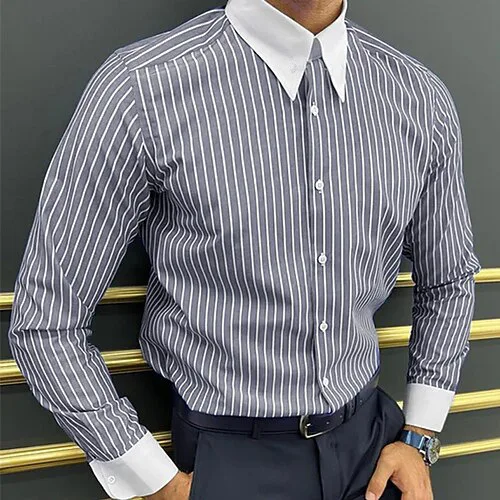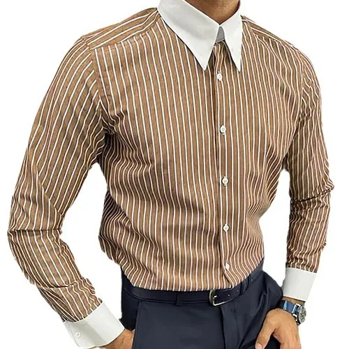 Custom Luxury Men's Spring Casual Striped French Cuff Shirts with Beaded Detail Full Sleeve Polyester Blend
