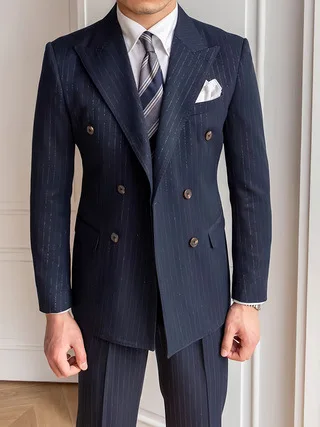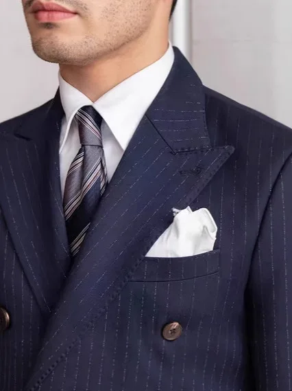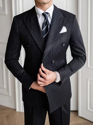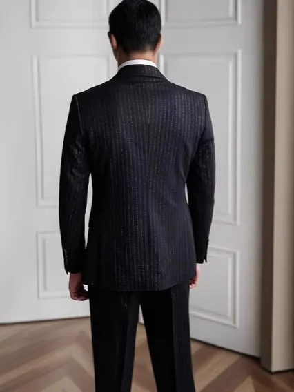 Hot Banquet Gold Stripe Double-breasted Elegant British Business Casual Retro Woolen Mandarin Collar Men Button Fly Flat Suits