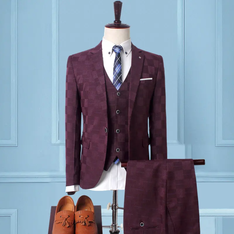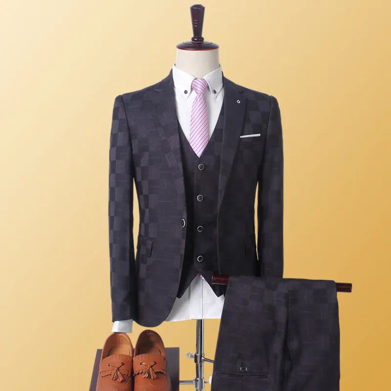 Three-piece Men's Plaid Business Casual Professional Slim-fit V-neck Italian Style Suit Set Groom Best Man Wedding Dress Beaded