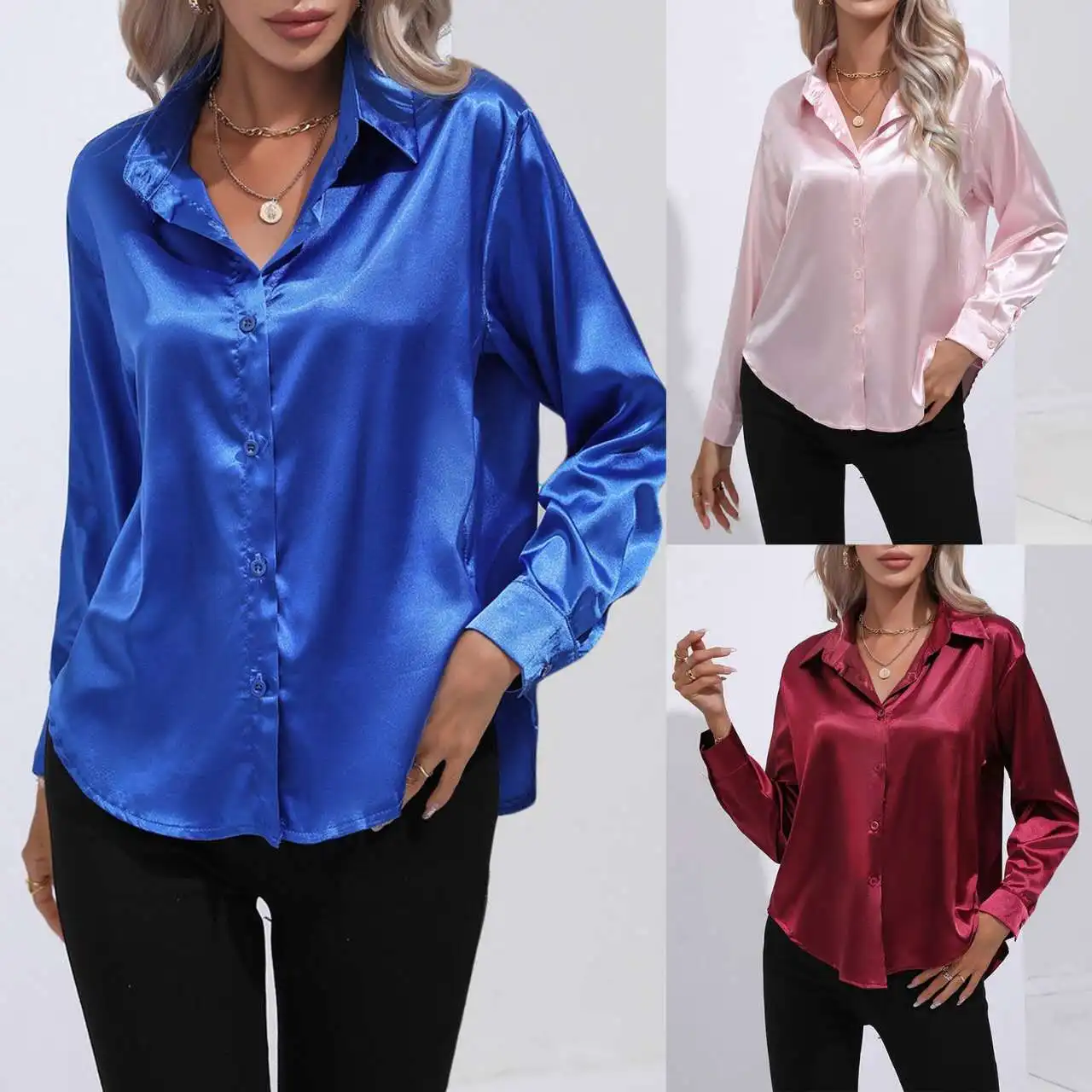 Womens Satin Shirts Solid Color Basic Casual Blouses Elegance Long Sleeve Lapel Button Up Office Top