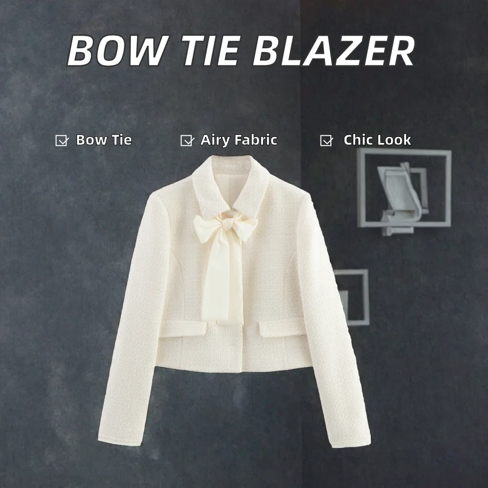 Beige Women's Casual Fashion Long Sleeve Turn Collar Bow Tie Single Breasted Solid Pattern Woven Button Decoration