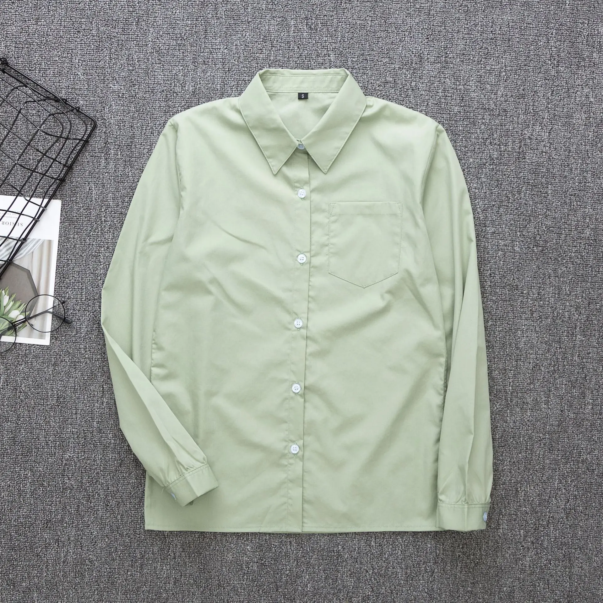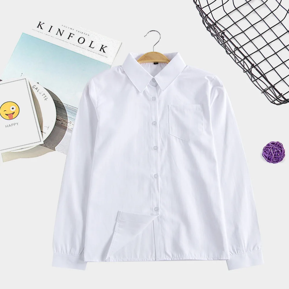 Women Non-Transparent Long-Sleeve White Shirt School Uniform Long Sleeves Angled Lapels