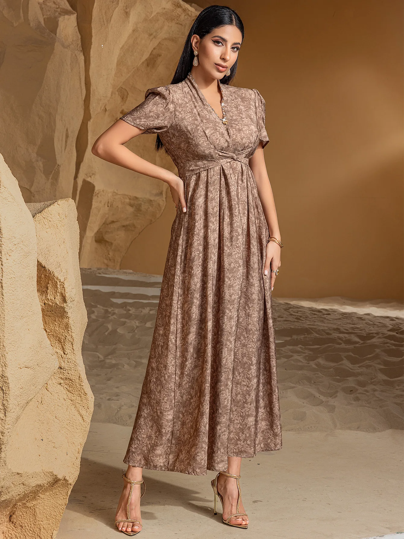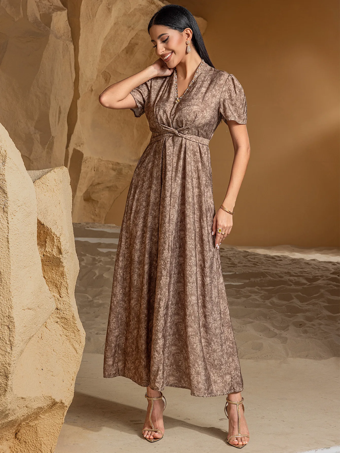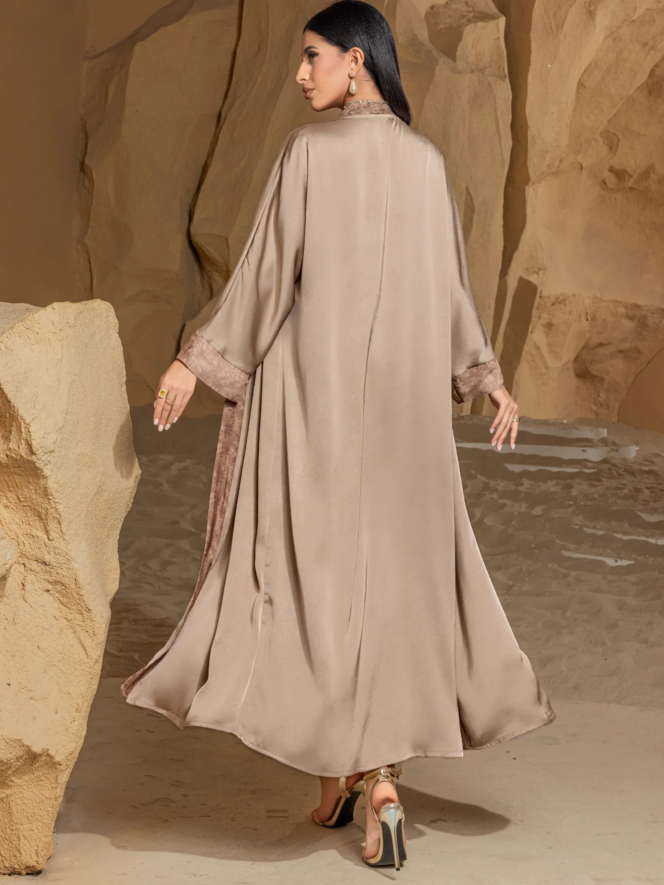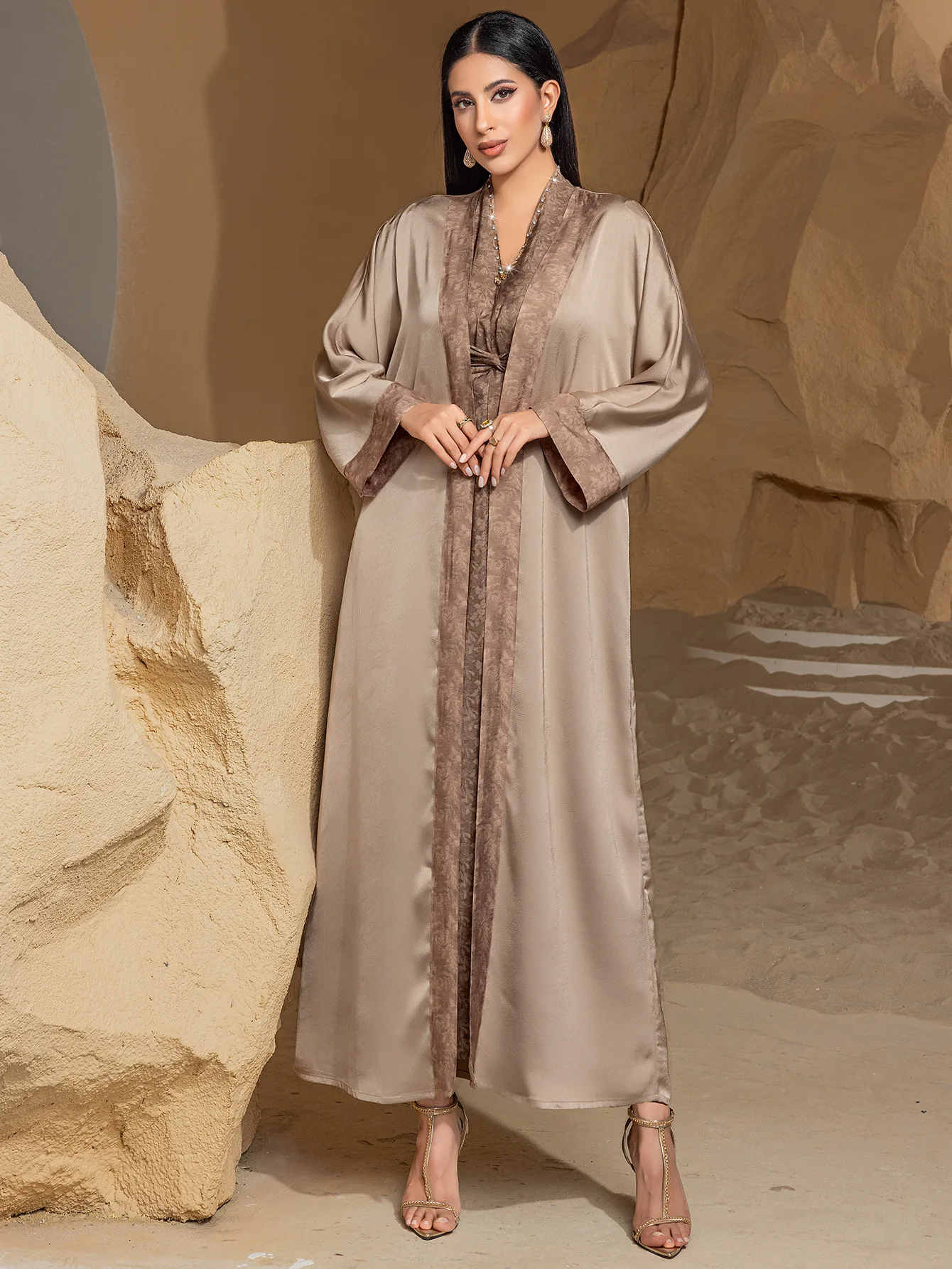 Khaki Two Piece Flowing Long Sleeve Cardigan Robe Women's Dress