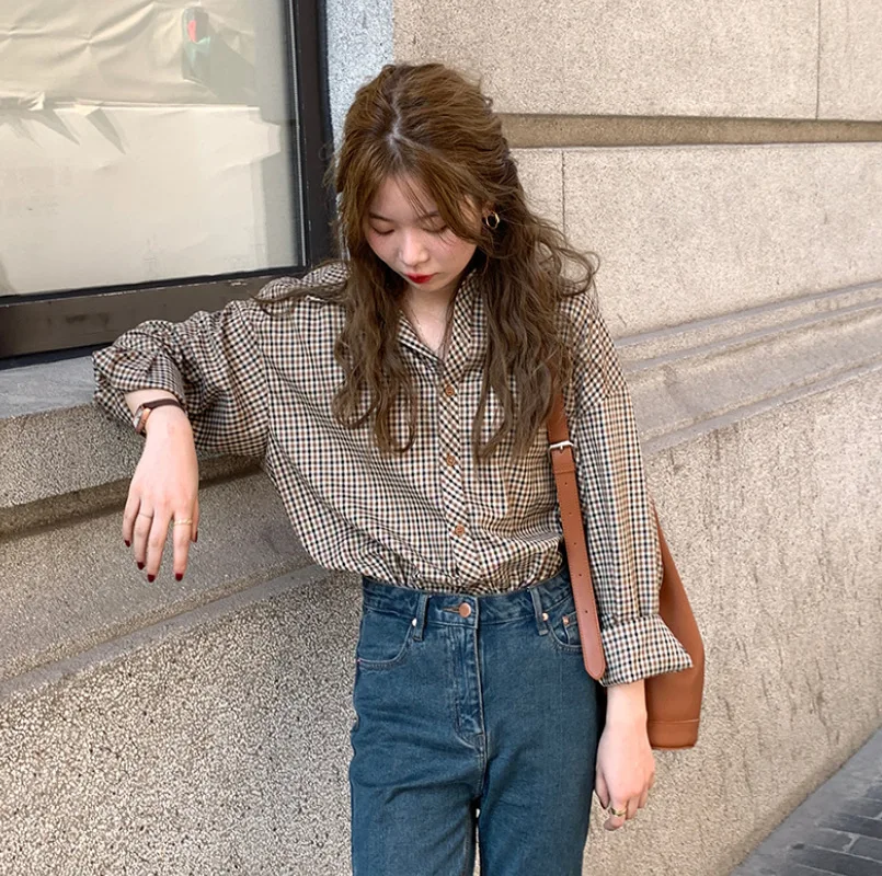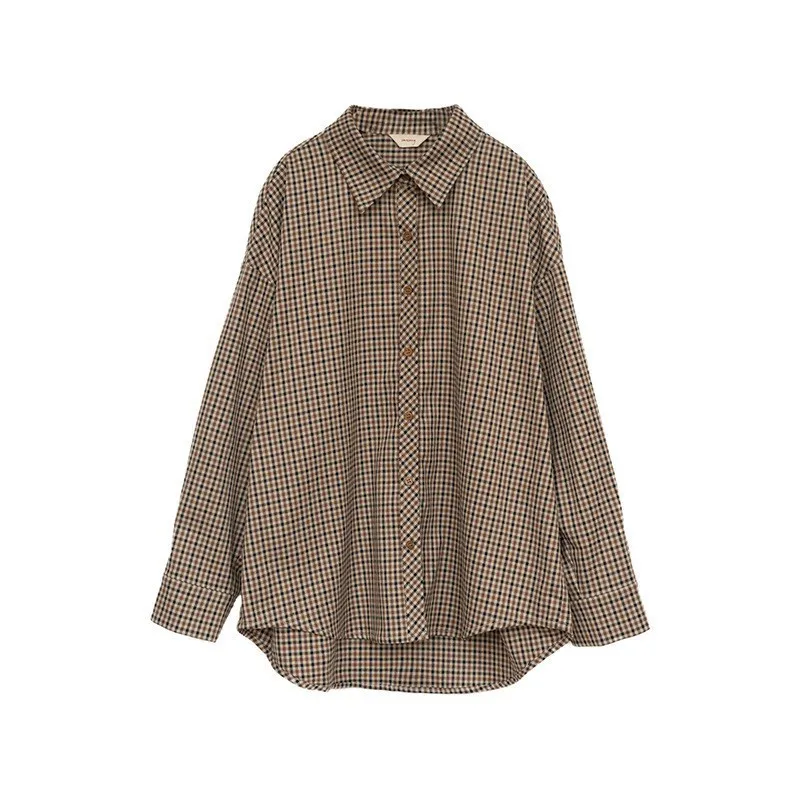 2026 Vintage Plaid Shirt Women Brown Oversized Long Sleeve