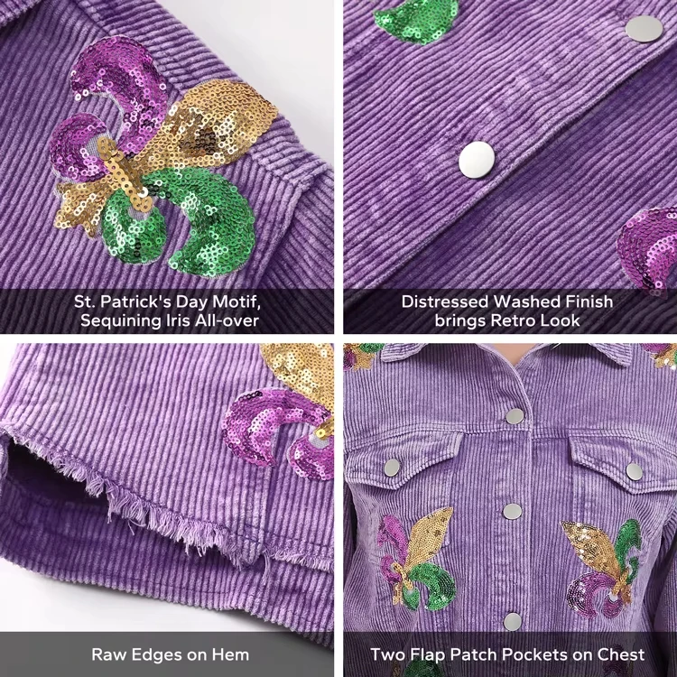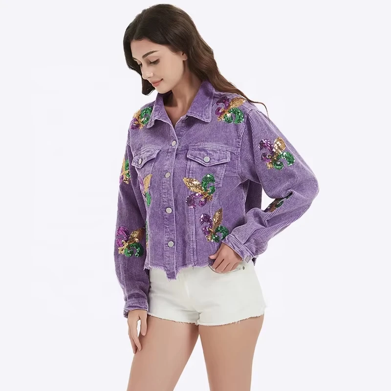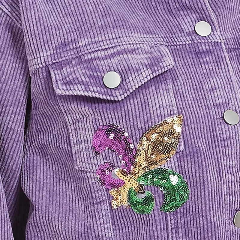 Popular Mardi Gras Crop S Women Sequining Iris Desgin Corduroy Shacket For Fall