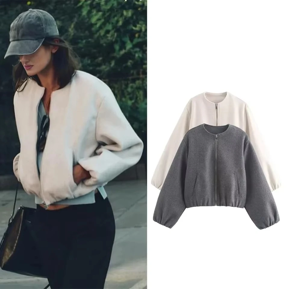 Women Coat Female Retro Round Neck Long Sleeve Elastic Hem Zipper Soft Bomber Ladies Fashion Autumn Winter