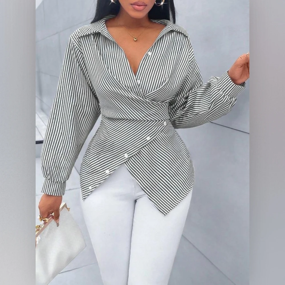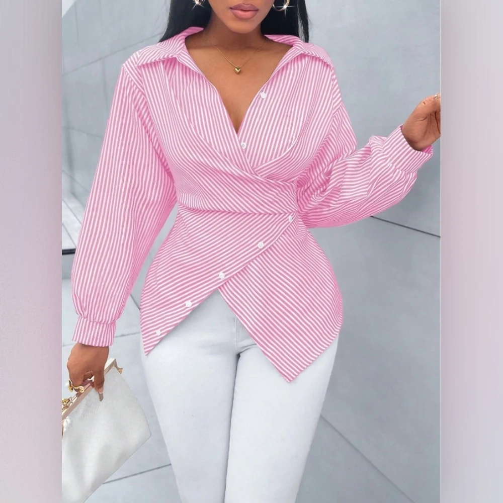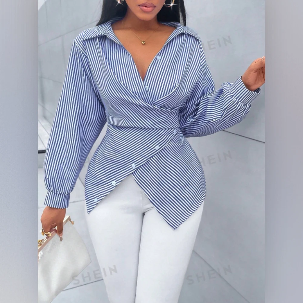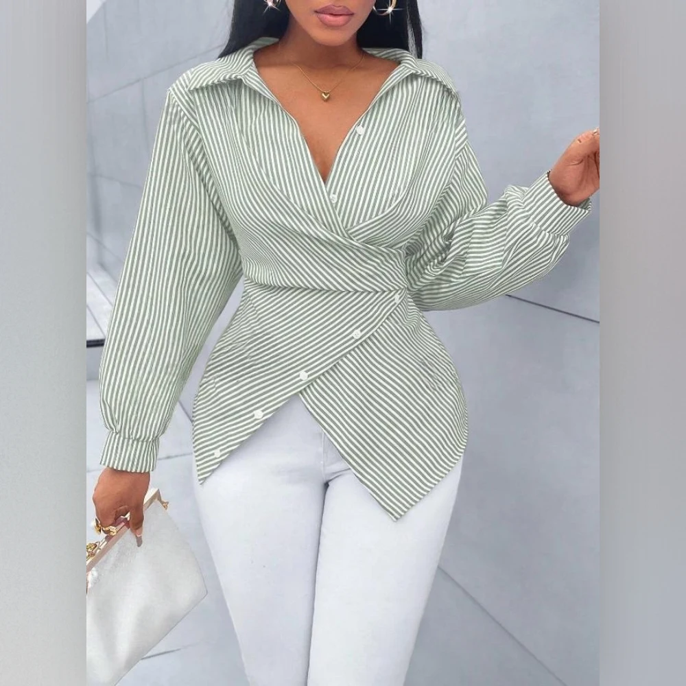 Women's Striped Long-Sleeve Shirt With Waist-Defining Tie Detail Top Sehe Fashion