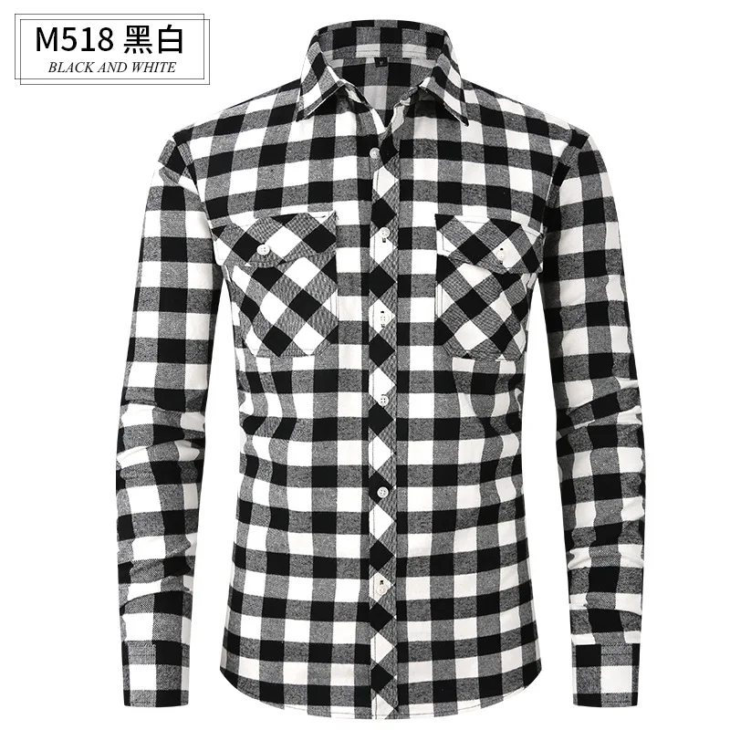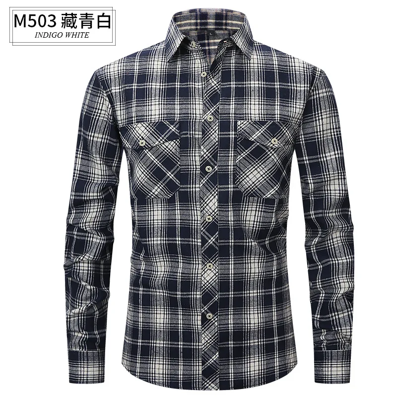 Men's Long-Sleeved Casual Shirt Spring/Summer Flannel Wool Plaid Slim-Fit Double Pocket Anti-Wrinkle Twill Fabric